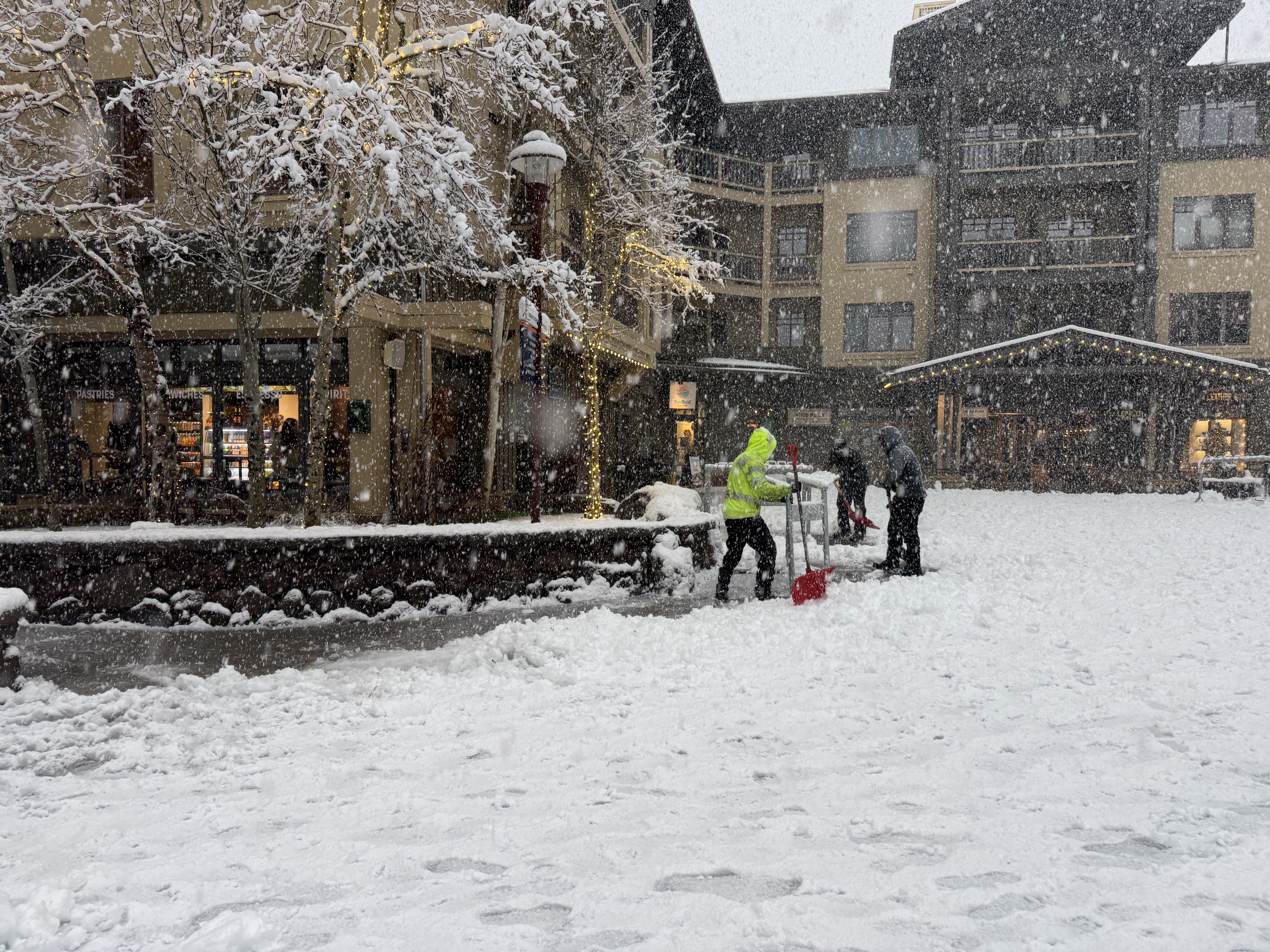 The image shows workers actively engaged in snow removal in a public area, likely focusing on clearing pedestrian pathways. Two individuals in high-visibility clothing are using snow shovels to manage the accumulation. Snow is continuously falling, contributing to challenging work conditions, and the built environment around suggests an urban or resort setting.