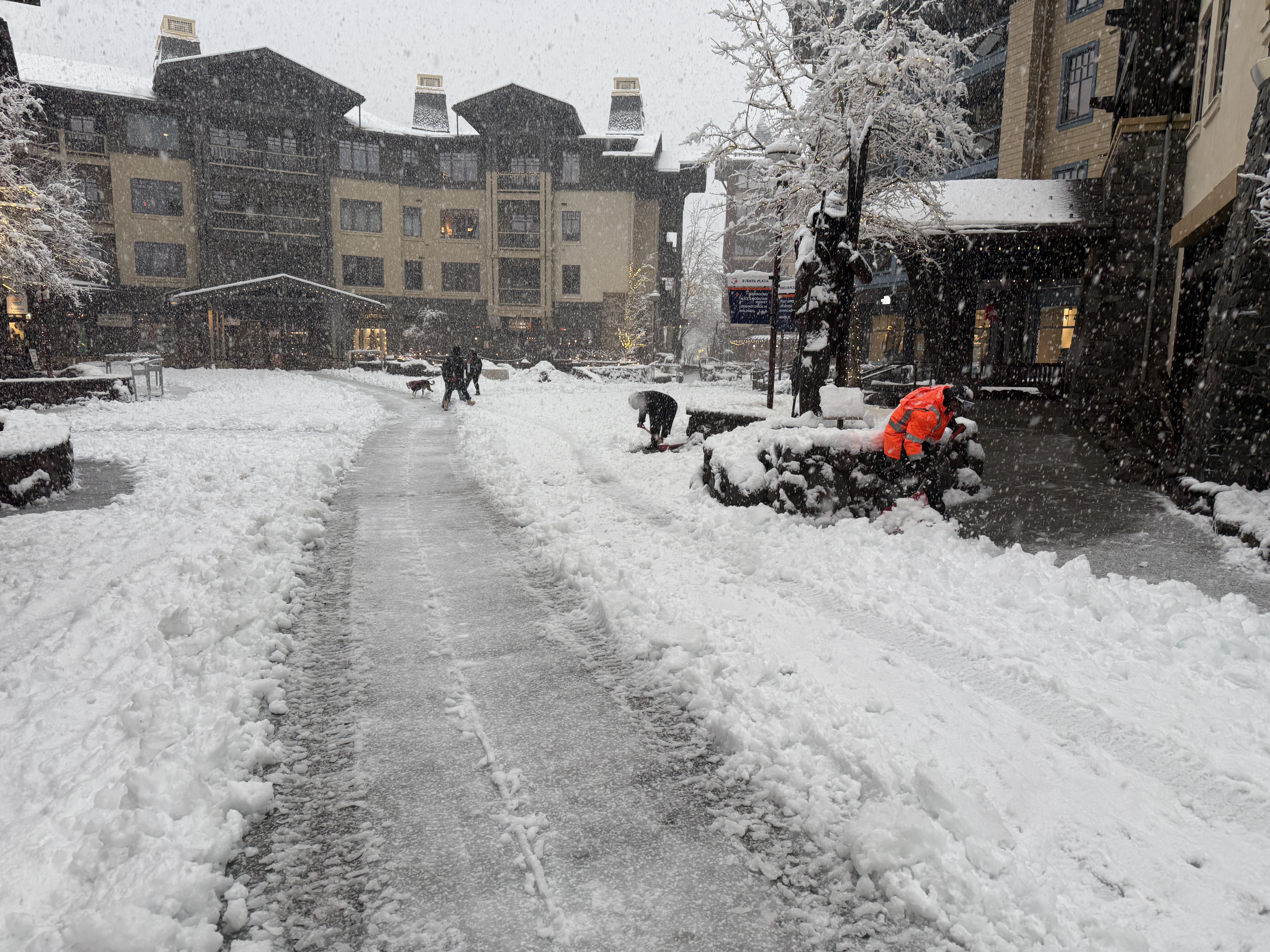 Early phase of snow clearing activities during heavy snowfall; ground surfaces are covered in snow with low visibility due to weather conditions.