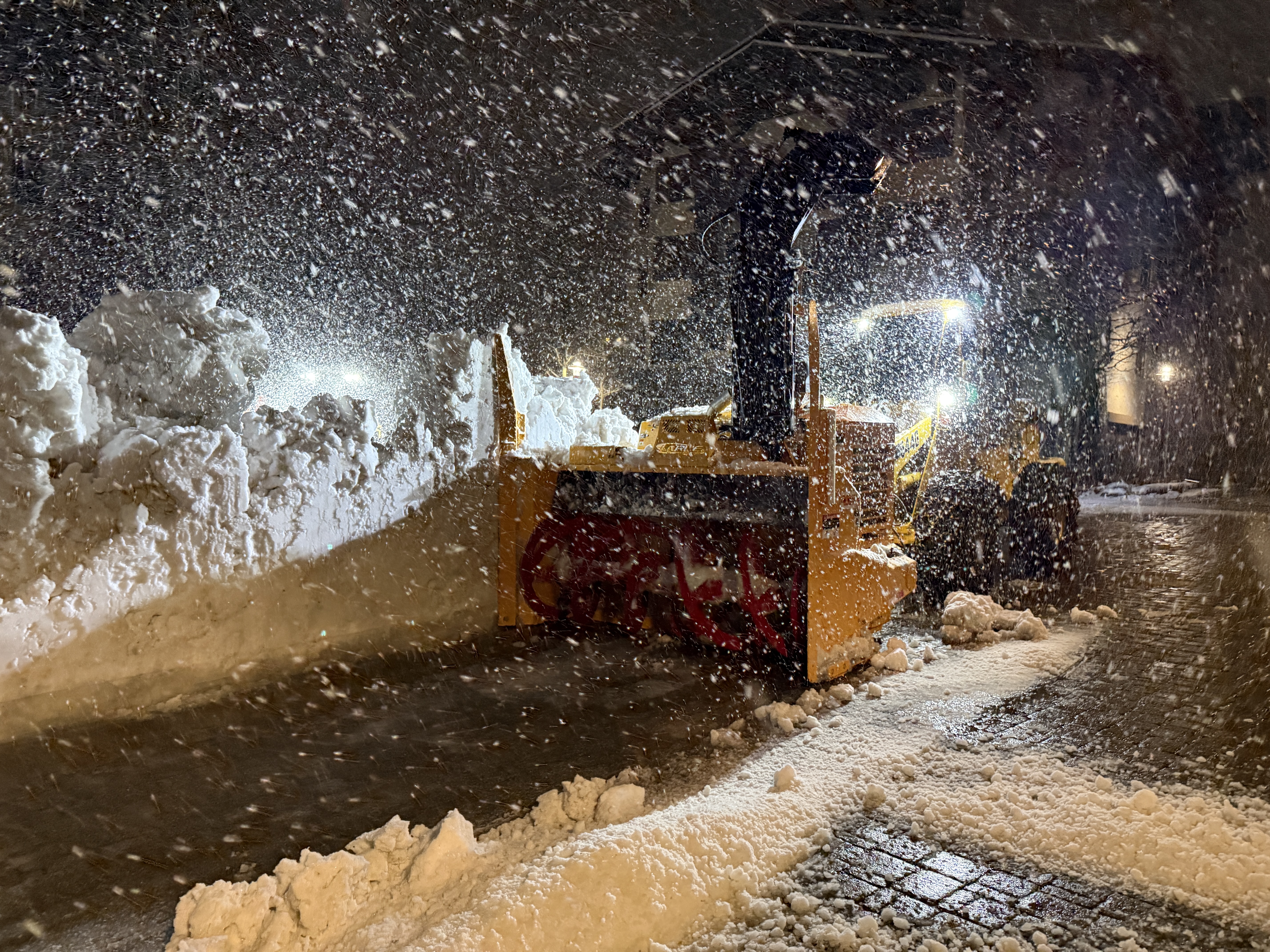 Mid-phase snow removal under heavy nighttime snowfall with slippery surface conditions.