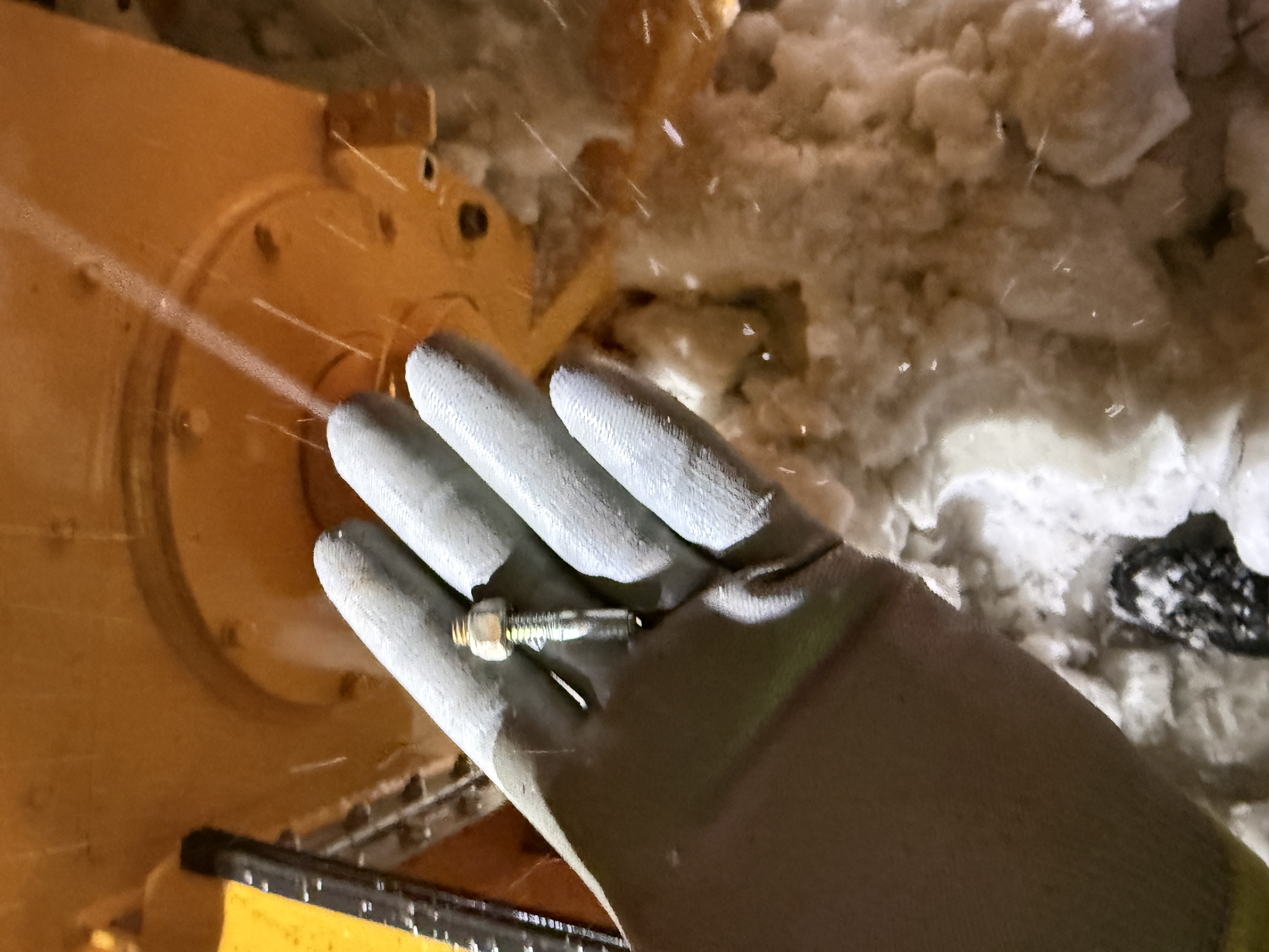 A gloved hand is holding a bolt, possibly indicating a maintenance activity or repair in progress. The background shows a mechanical component painted yellow against a backdrop of snow, suggesting operations involving snow removal equipment. The image appears to be captured during a snowstorm, as indicated by visible snowflakes and accumulation.