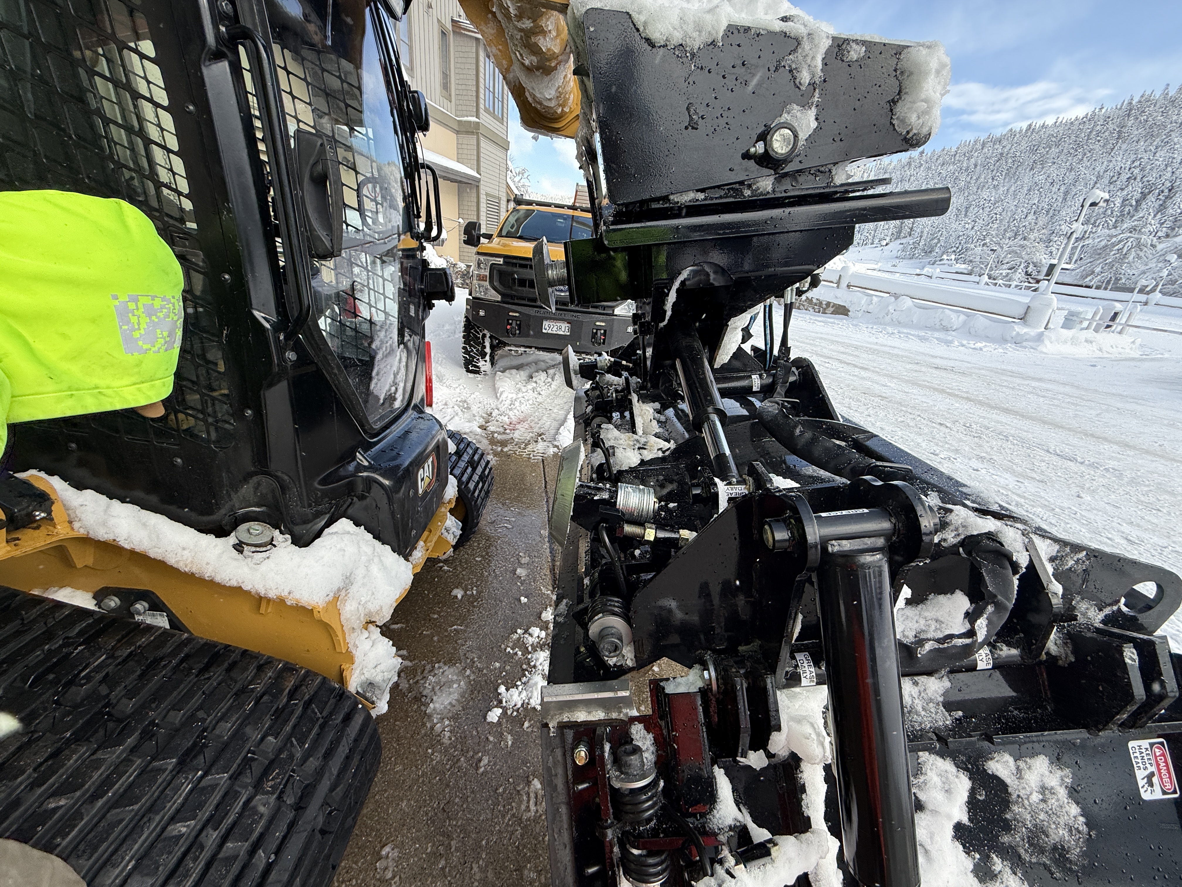 The photo shows a snow removal operation involving a tracked skid steer loader and a heavy-duty snow blower attachment. The equipment is actively being used to clear accumulated snow from a paved surface in a mountainous area. The vehicles are positioned adjacent to a building, indicating ongoing site maintenance in snowy weather conditions. Snow is visibly packed around the machinery, and tire tracks suggest recent movement.