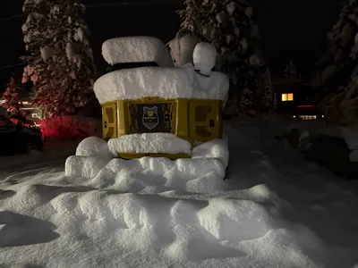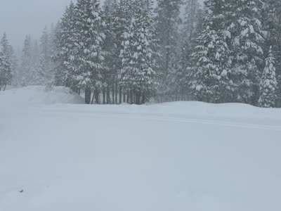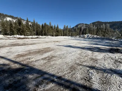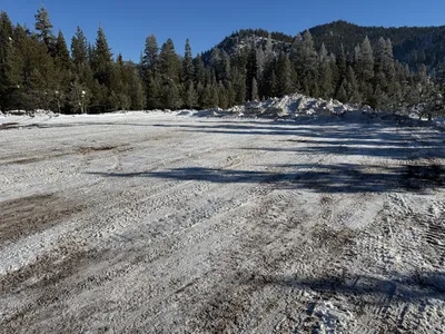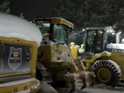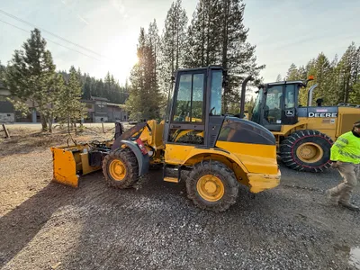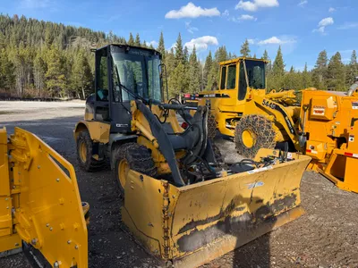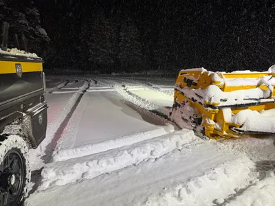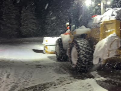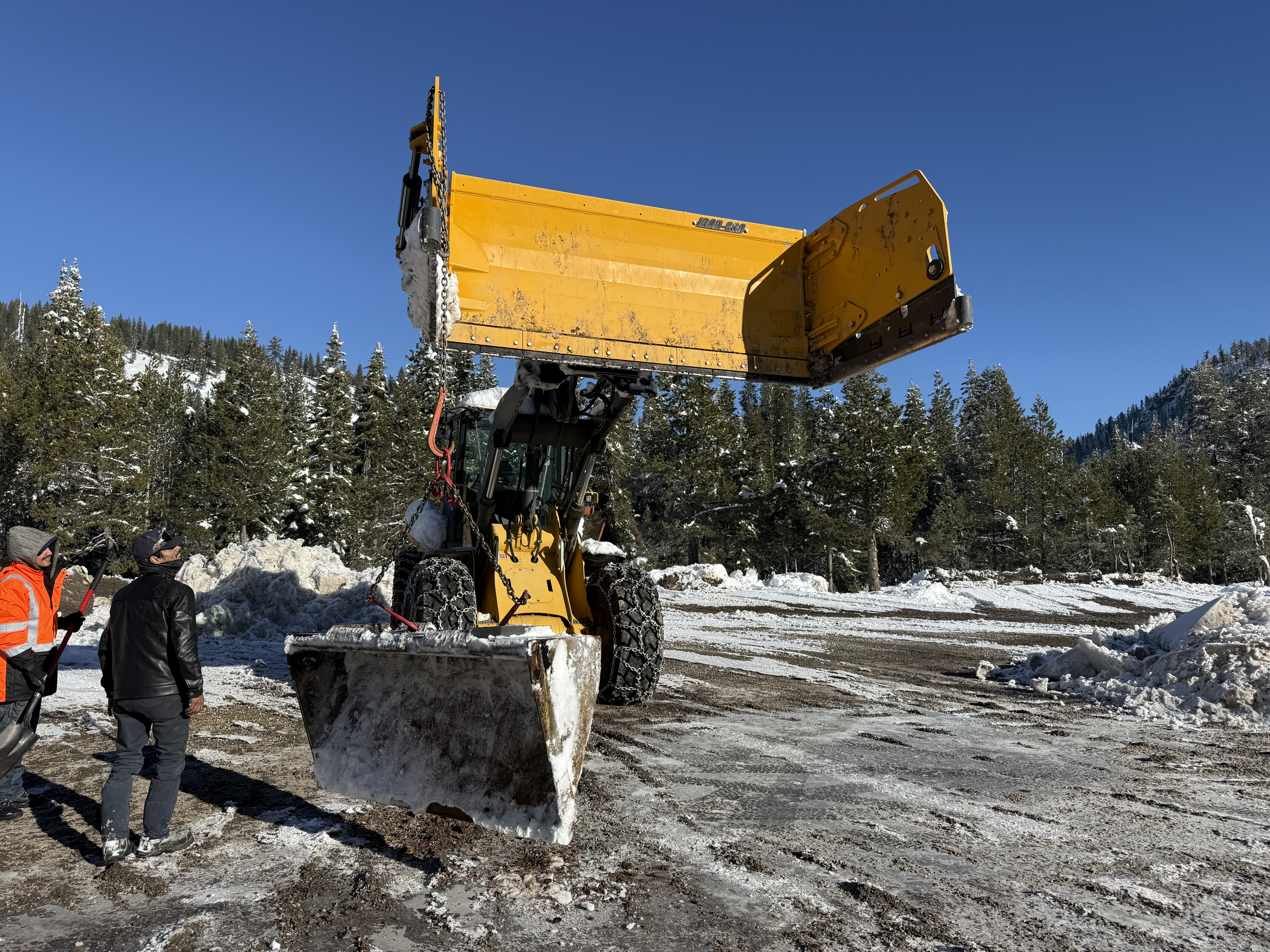 The photo shows a snow removal operation taking place in a forested mountainous area. A large yellow snow plow with chains on its tires is actively being used, with its bucket raised. Two workers in cold weather gear are observing the operation. The site appears to be clear of snow, indicating ongoing maintenance work.