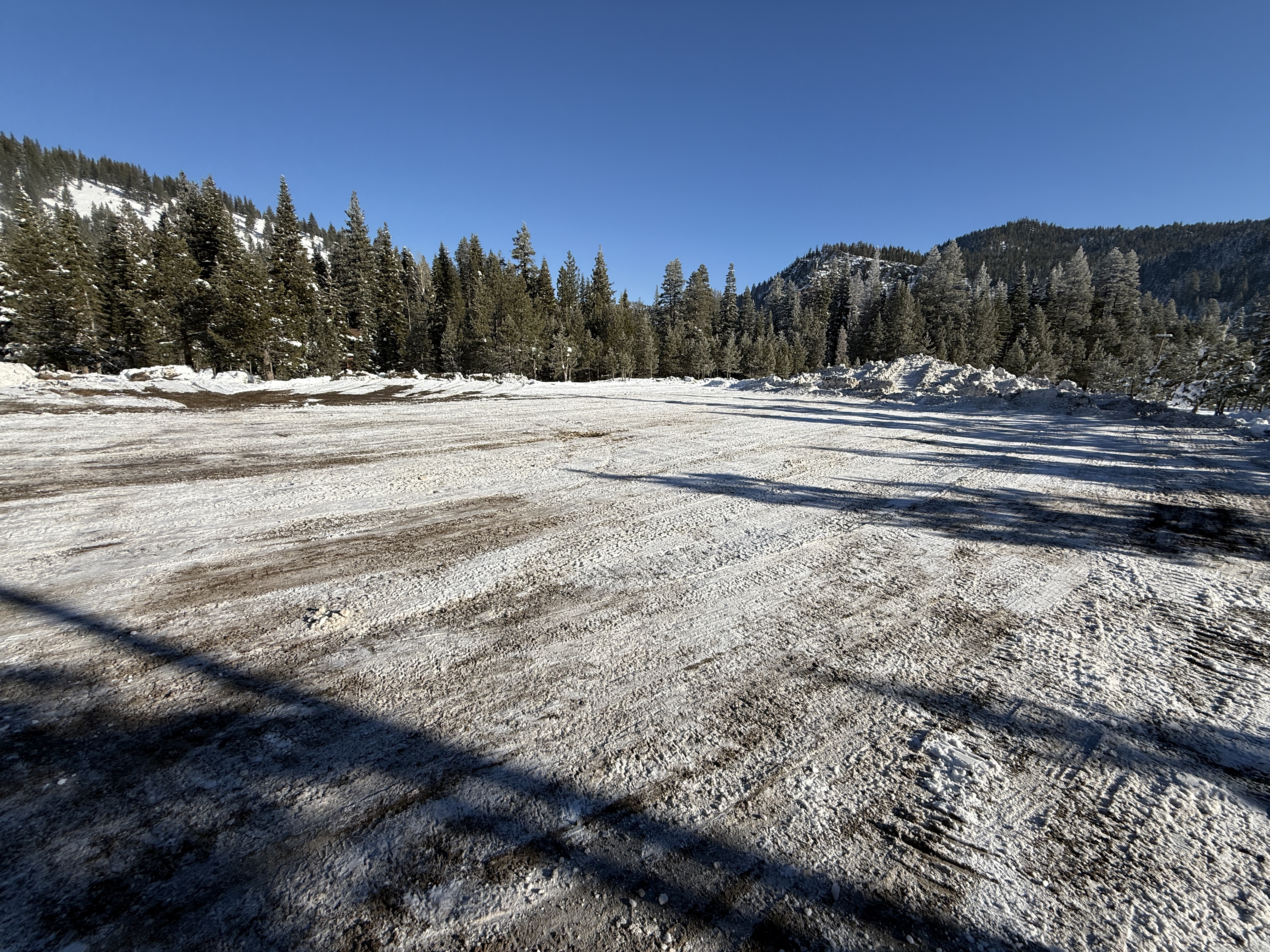 The photo shows a cleared and partially snow-covered construction site in a forested area, likely prepared for snow removal operations. There are no active construction activities visible in the image. The site seems to be in an early stage of preparation with no materials or construction components in place. The area is flat and covered with light snow, suggesting ongoing site grading and possible storm water management preparations.