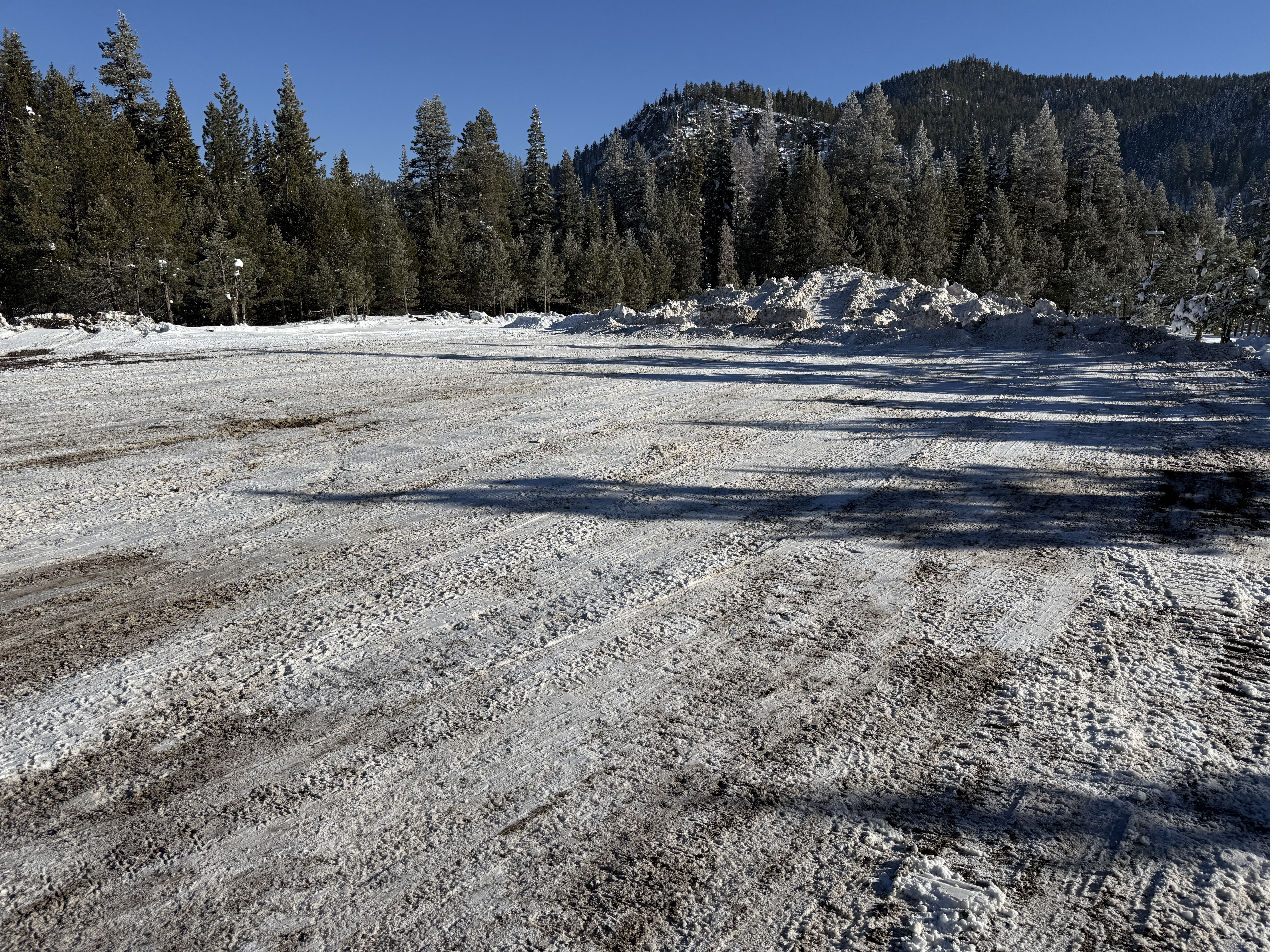 The photo shows an area cleared of snow, likely for ongoing or future construction activities. No active work is visible, indicating site preparation or pause in construction. Snow piles and possible tire tracks suggest recent snow removal from this section. No materials, equipment, or construction components are present.