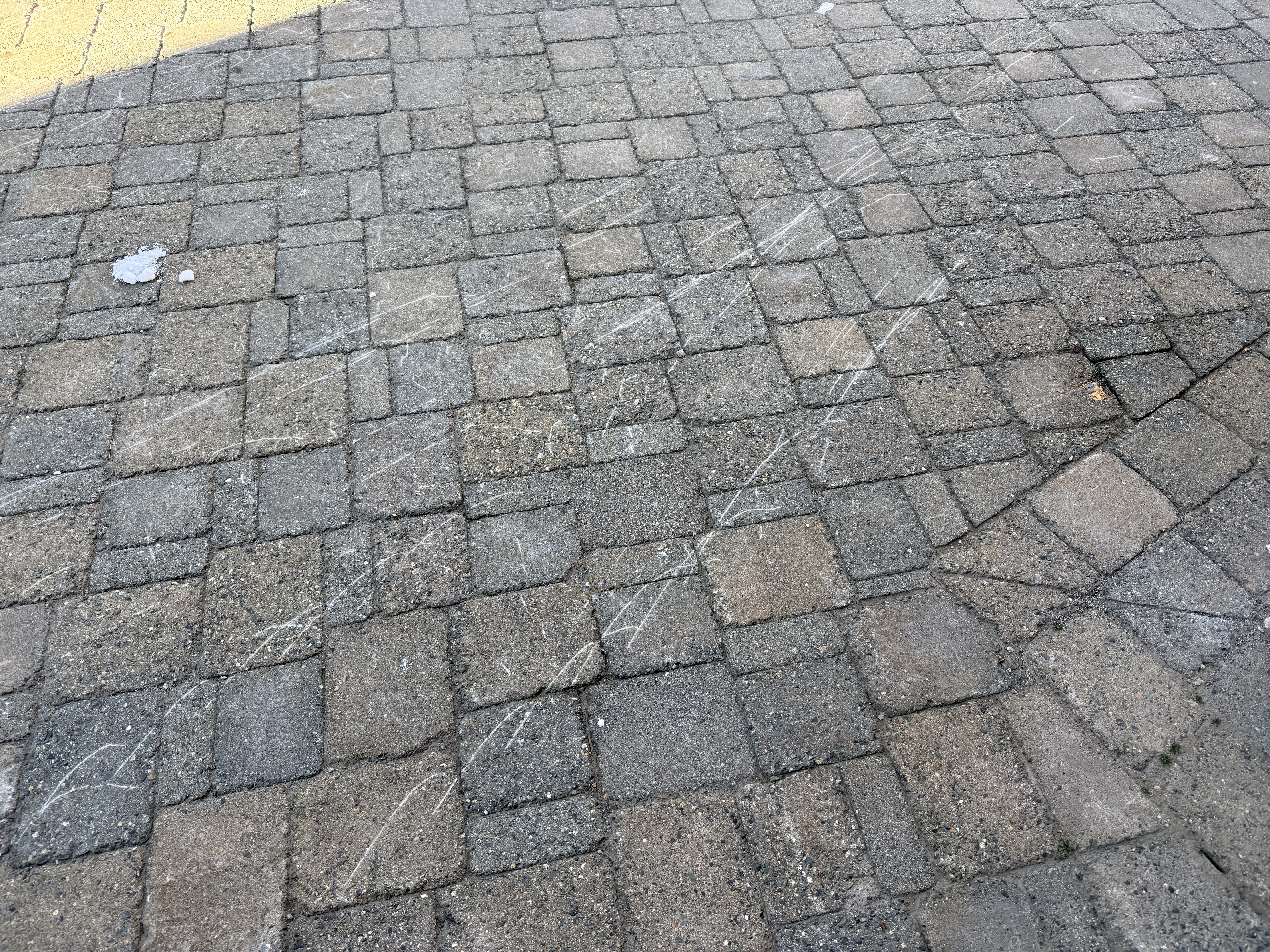The image shows a paved area, possibly completed or awaiting further construction work. The paving consists of interlocking concrete pavers with visible chalk markings, suggesting layout or alignment adjustments. There are also some signs of debris or residue on the surface.