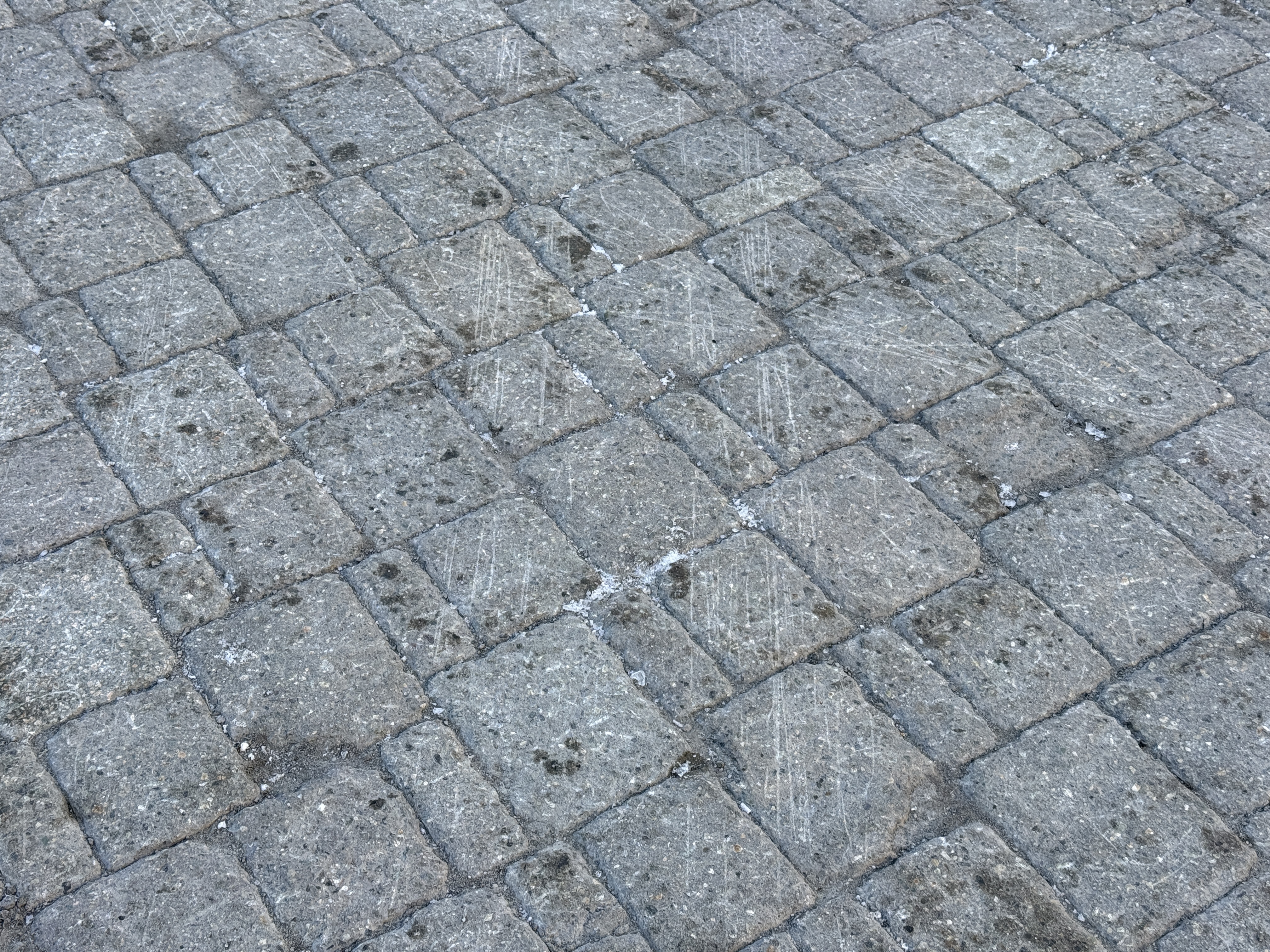 The photo displays a section of cobblestone pavement with visible scrape marks, likely from machinery or equipment in contact with the surface. There is no active construction machinery or personnel present in the image. The surface appears to be in a final state, intended for pedestrian or vehicular use. The absence of active work indicates a phase of project completion related to surface restoration.
