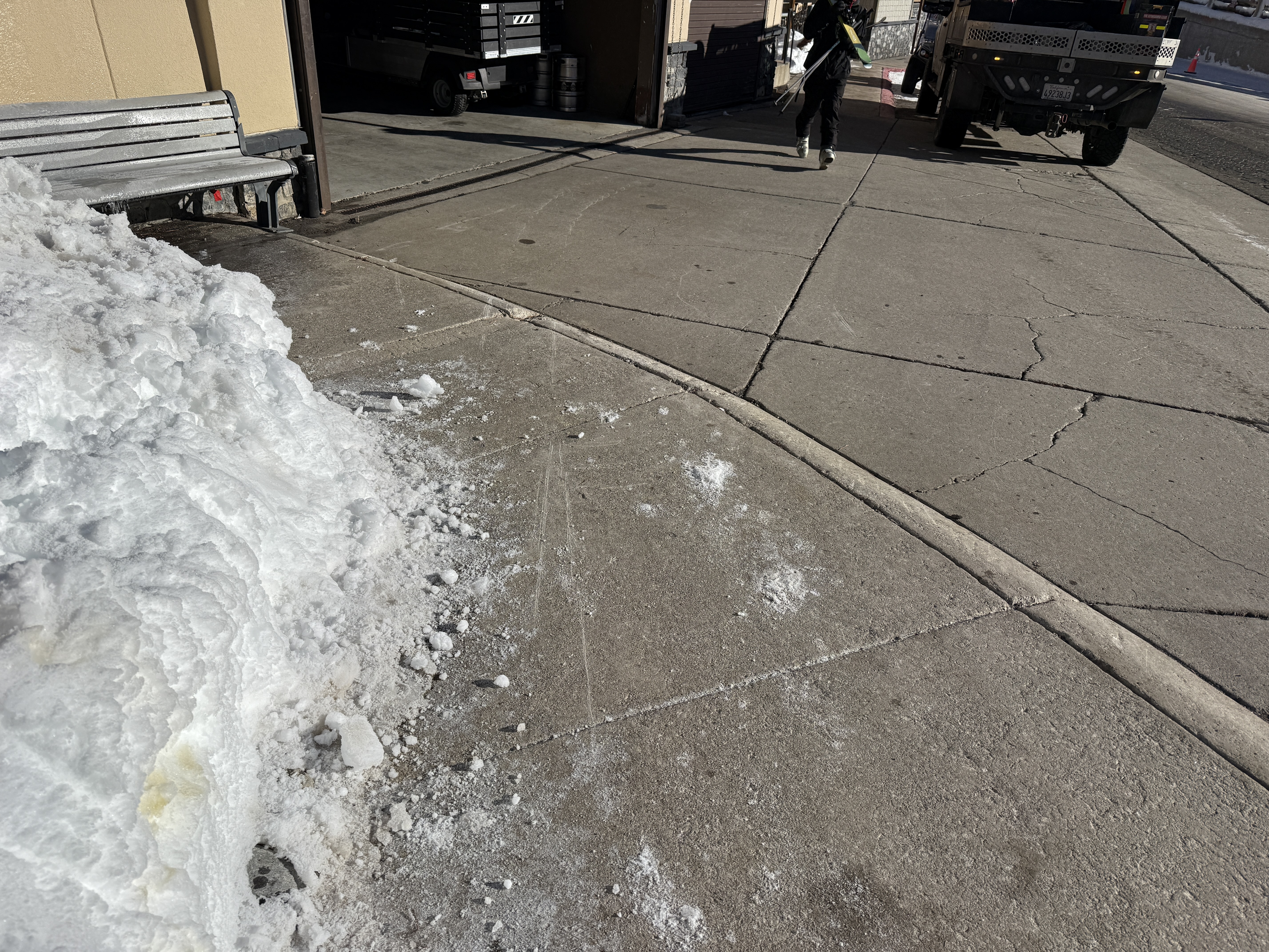 The photo shows snow removal activities with a pile of compacted snow on a concrete sidewalk adjacent to a building. A person is visible carrying a snow shovel, walking towards a truck parked alongside a curb. The area prompts careful consideration for pedestrian access and potential slip hazards due to scattered snow and ice.