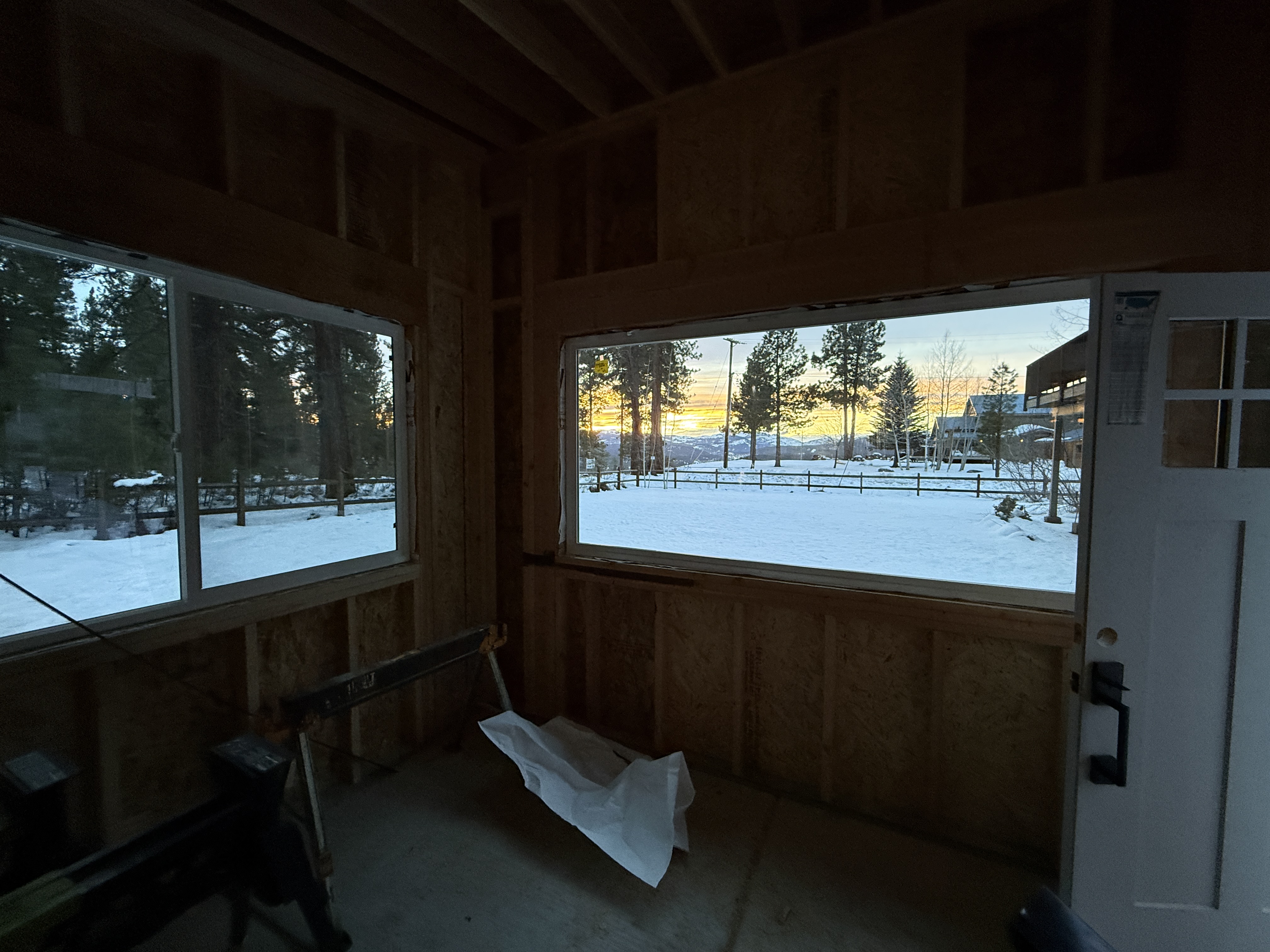 The image shows an interior construction space with unfinished wood framing and no visible construction activities in progress. The framing appears to be for a window and door installation, with natural light coming through the openings. The ground is covered in snow outside, indicating cold weather conditions.