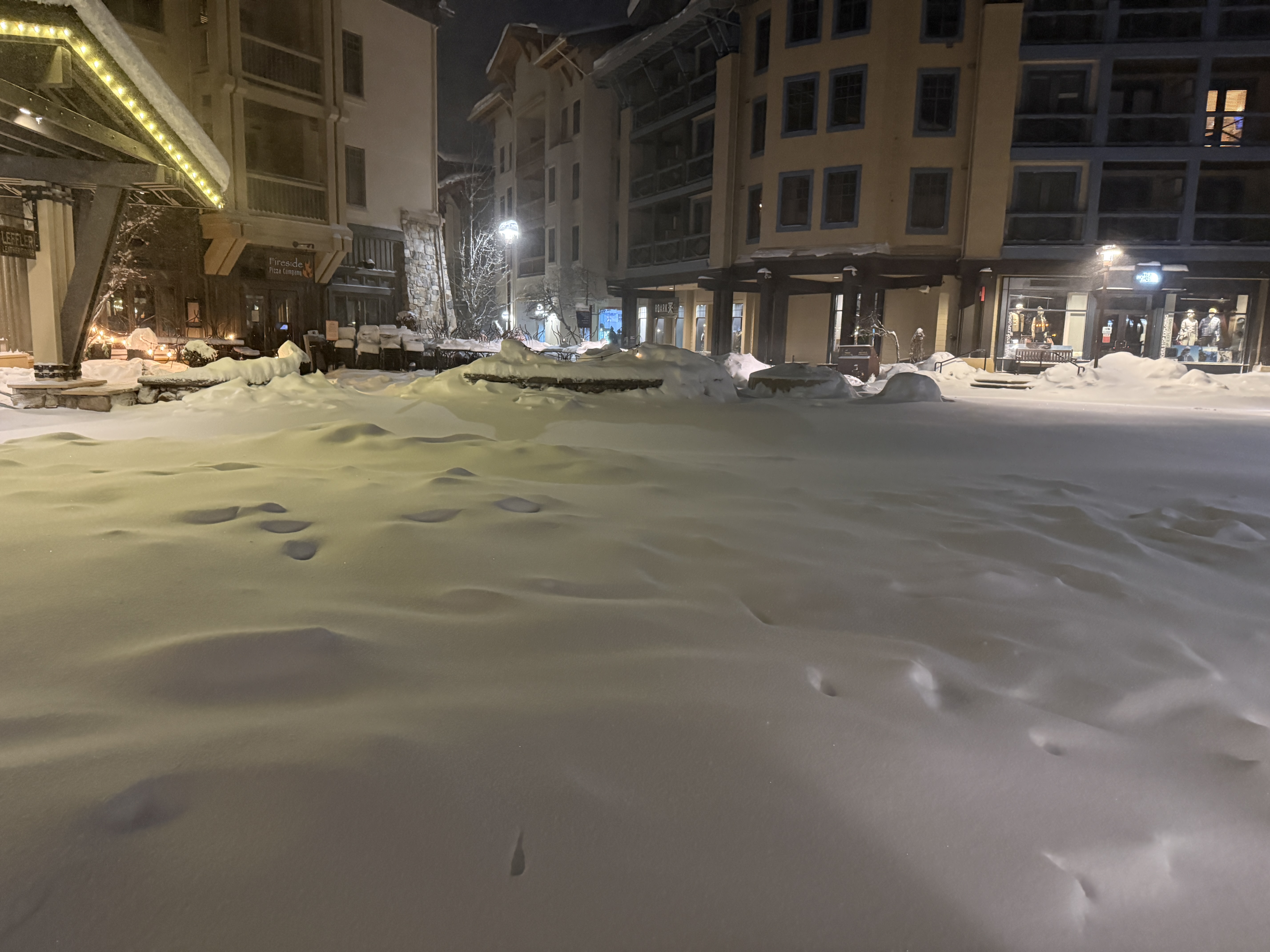 The photo shows a snow-covered area in a village-like setting, likely paused due to adverse weather conditions. No active construction activities are visible, and the site appears to be in a dormant state due to heavy snowfall. Buildings and storefronts are visible in the background with snow accumulation on rooftops and ground surfaces.
