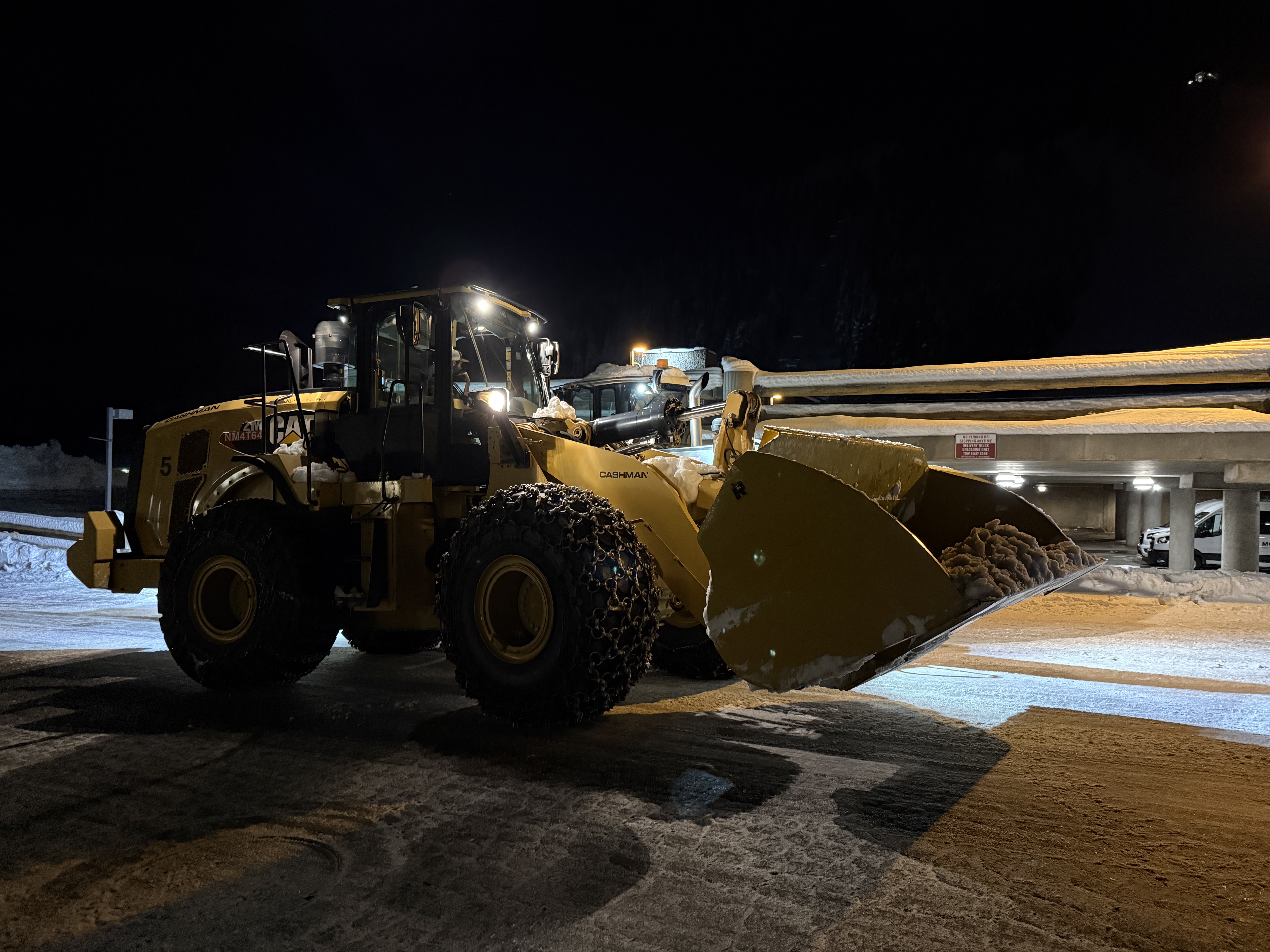 The photo shows a large yellow wheel loader actively engaged in snow removal operations, with the loader's bucket filled with packed snow. The loader is illuminated by its own headlights as well as external lighting, indicating work is being conducted during nighttime. The surrounding area is covered in snow, and there is a multi-level parking structure in the background.