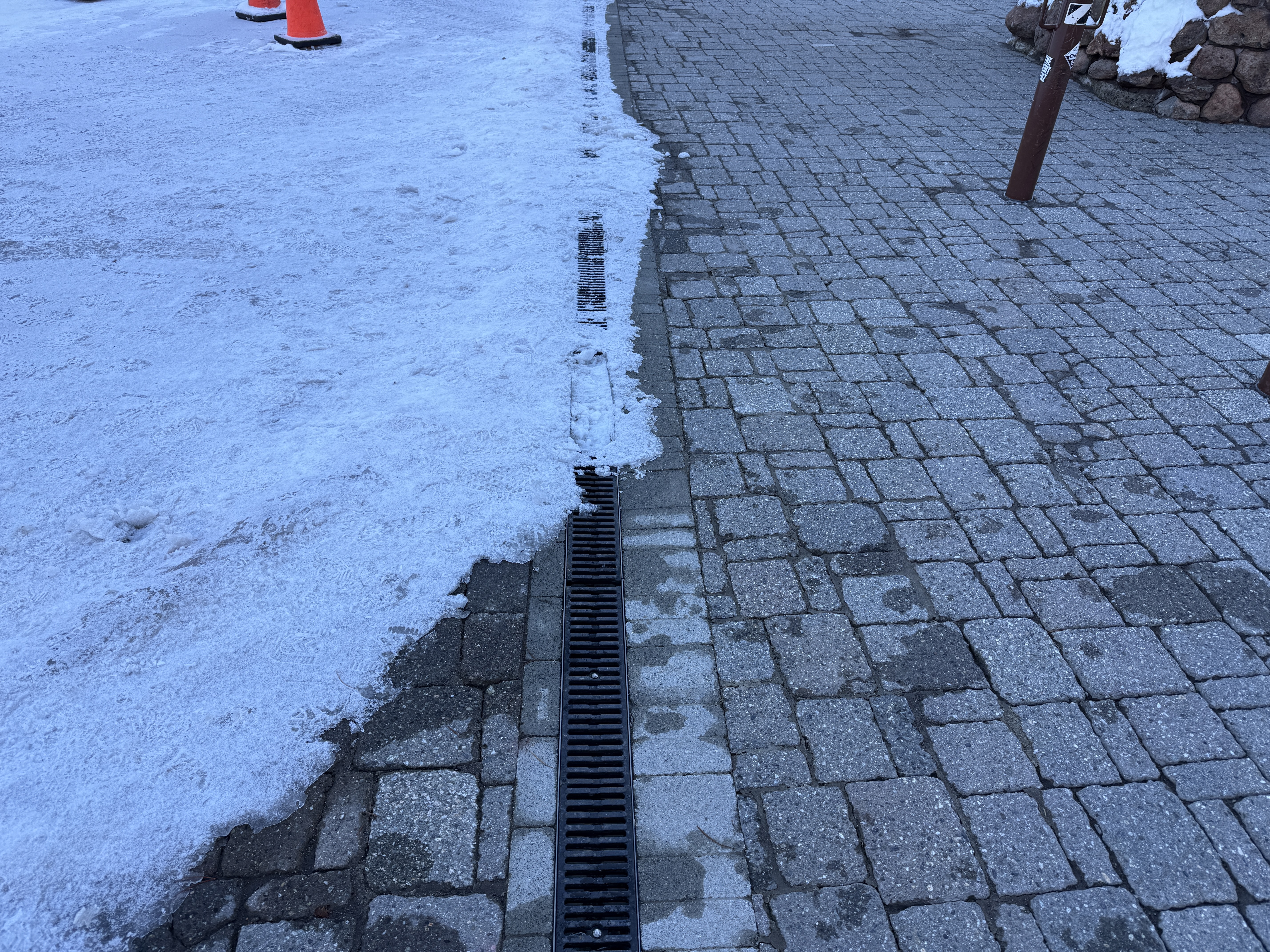The image shows a paved sidewalk with a stormwater drainage trench covered by a metal grate. Snow is accumulated on the left side of the trench, indicating recent snow removal activities. The site appears to be in a surface restoration phase with the drainage components already installed.