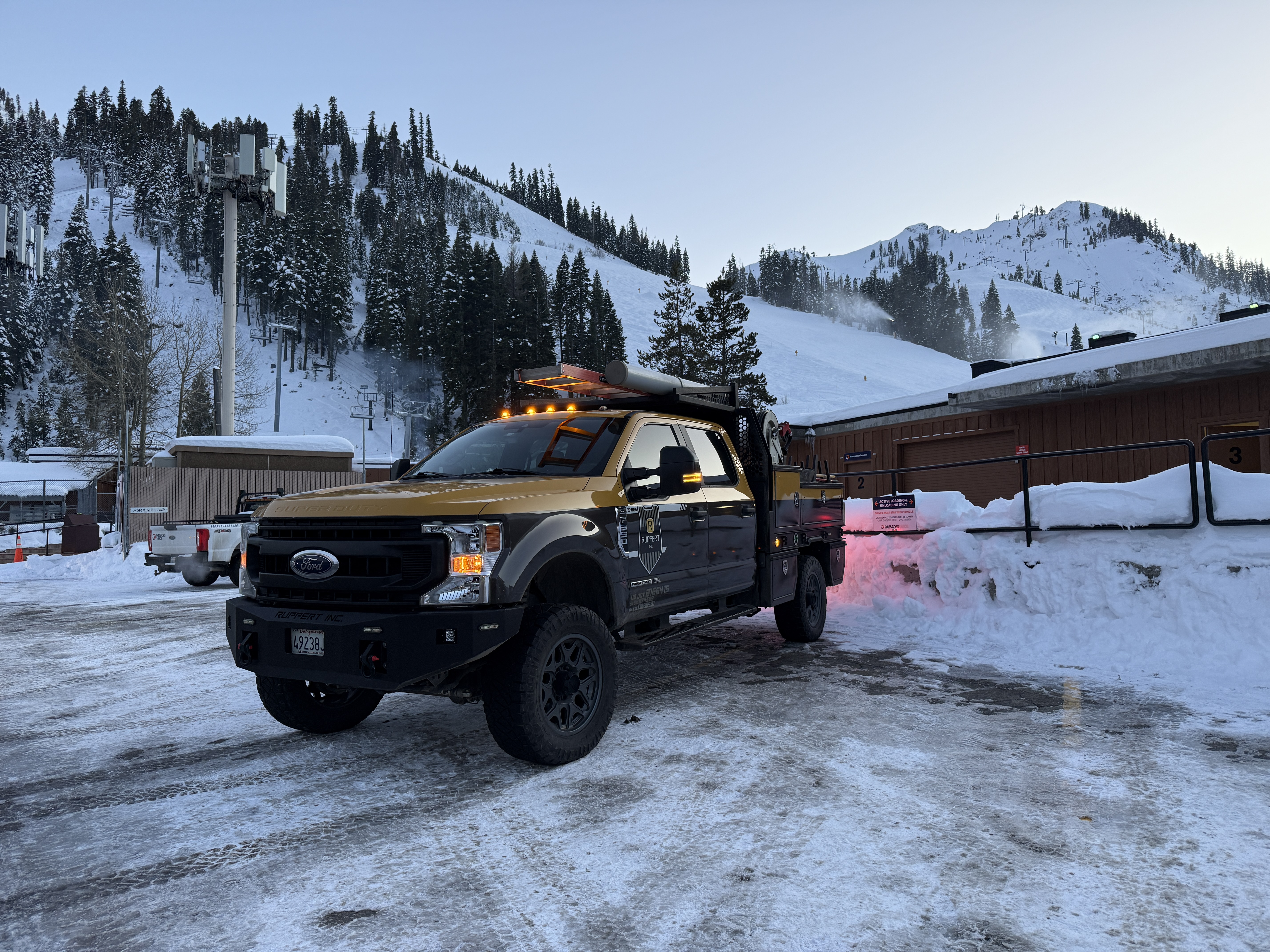 The photo shows a Ford truck equipped with snow removal equipment parked in a snowy area, likely utilized for maintaining clear access routes. The surroundings include snow-covered terrain and a facility building, indicative of a maintenance and preparation phase for winter conditions. The overall site appears to be in a staging state for further operations.