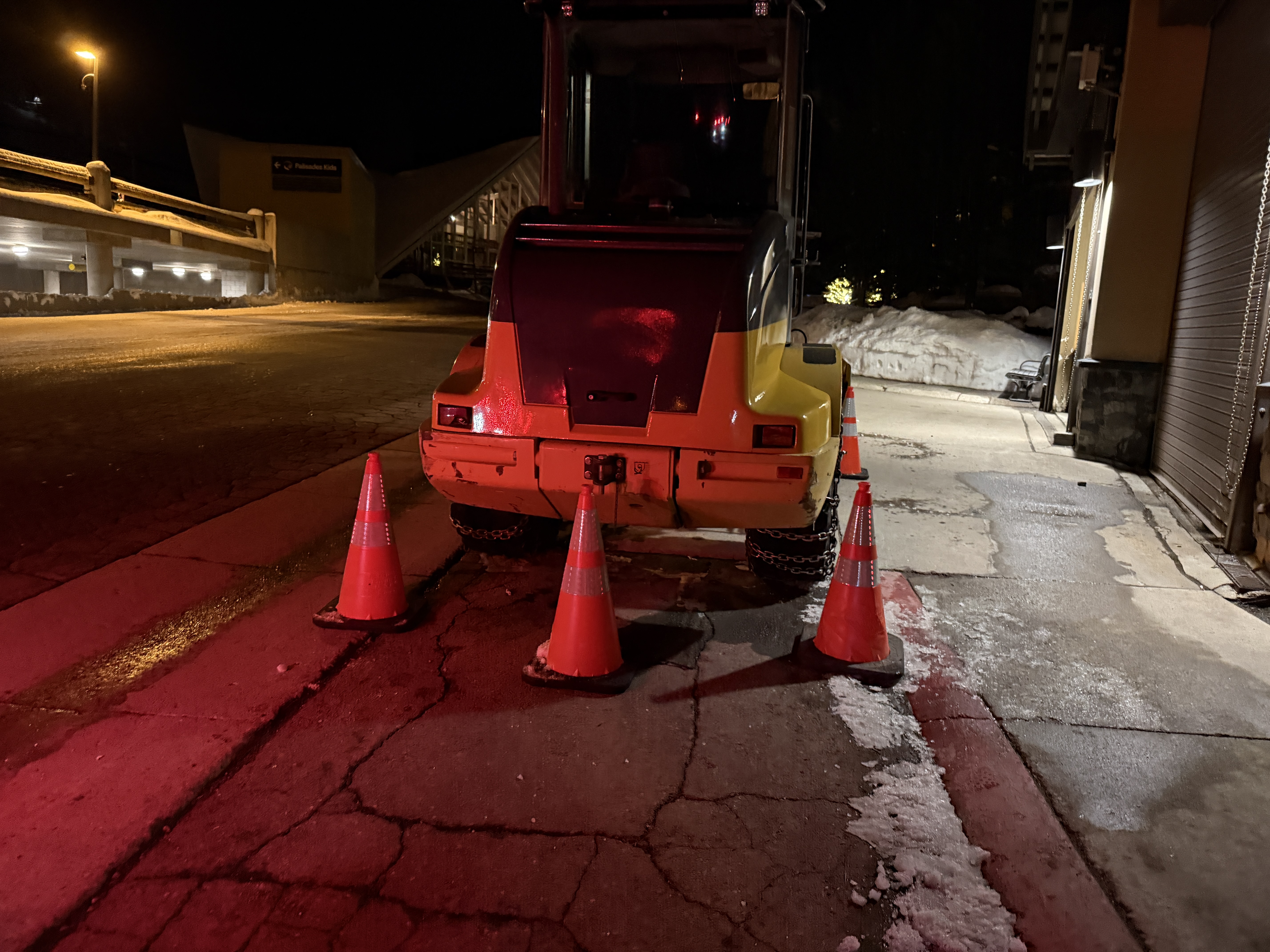 The photo shows a small construction vehicle, possibly a snow removal equipment, parked on a street at night with several traffic cones placed around it. The vehicle appears to be in standby mode near a construction area possibly related to stormwater management. The surroundings show snow accumulation at the edges, indicating ongoing or recent snow removal activities.