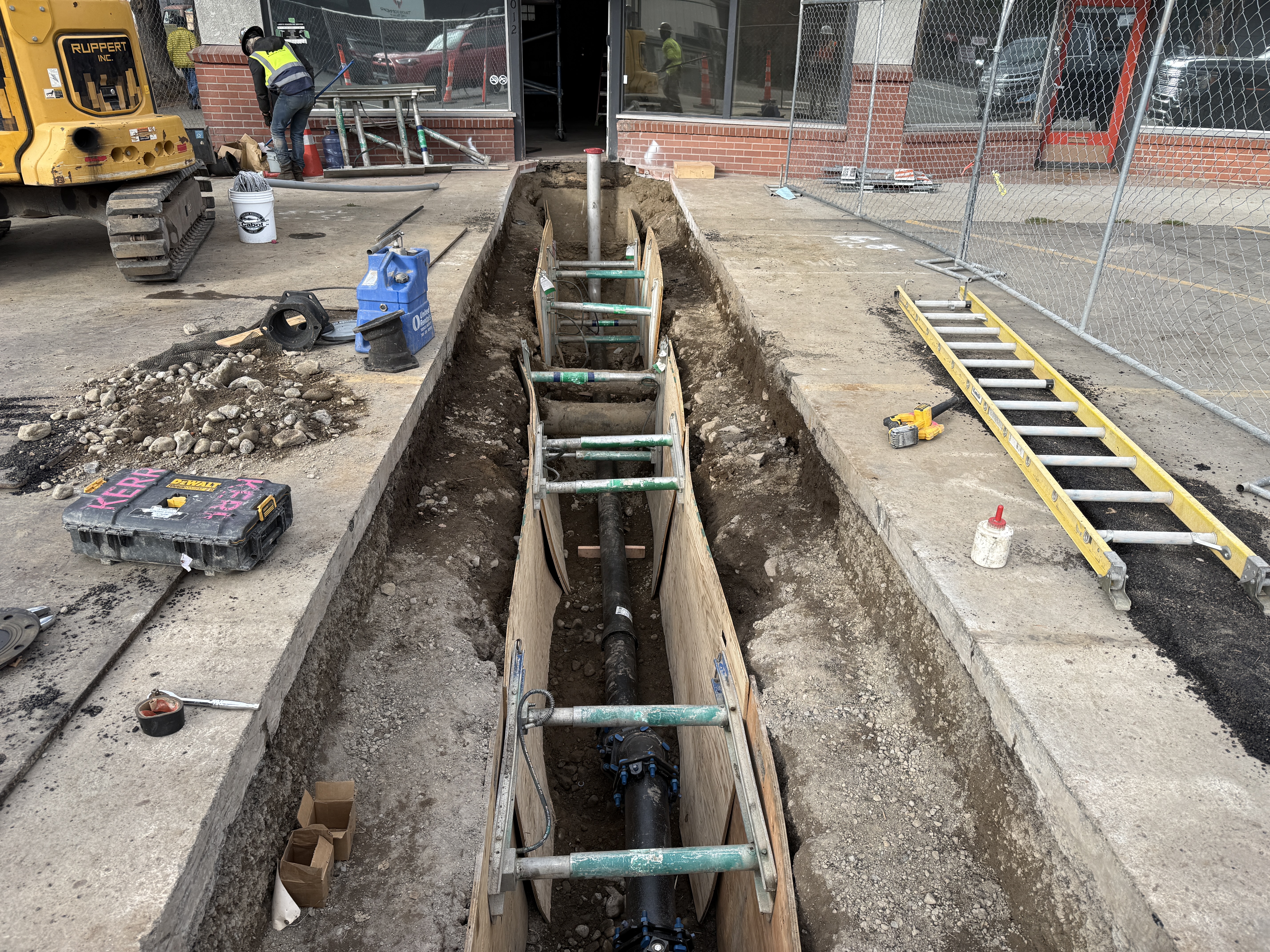 The image depicts an active construction site where a trench has been excavated for pipeline installation. Visible are ductile iron pipes supported by timber shoring with trench boxes. Tools and equipment like a CAT excavator and a ladder are present, and construction materials are scattered around the site.