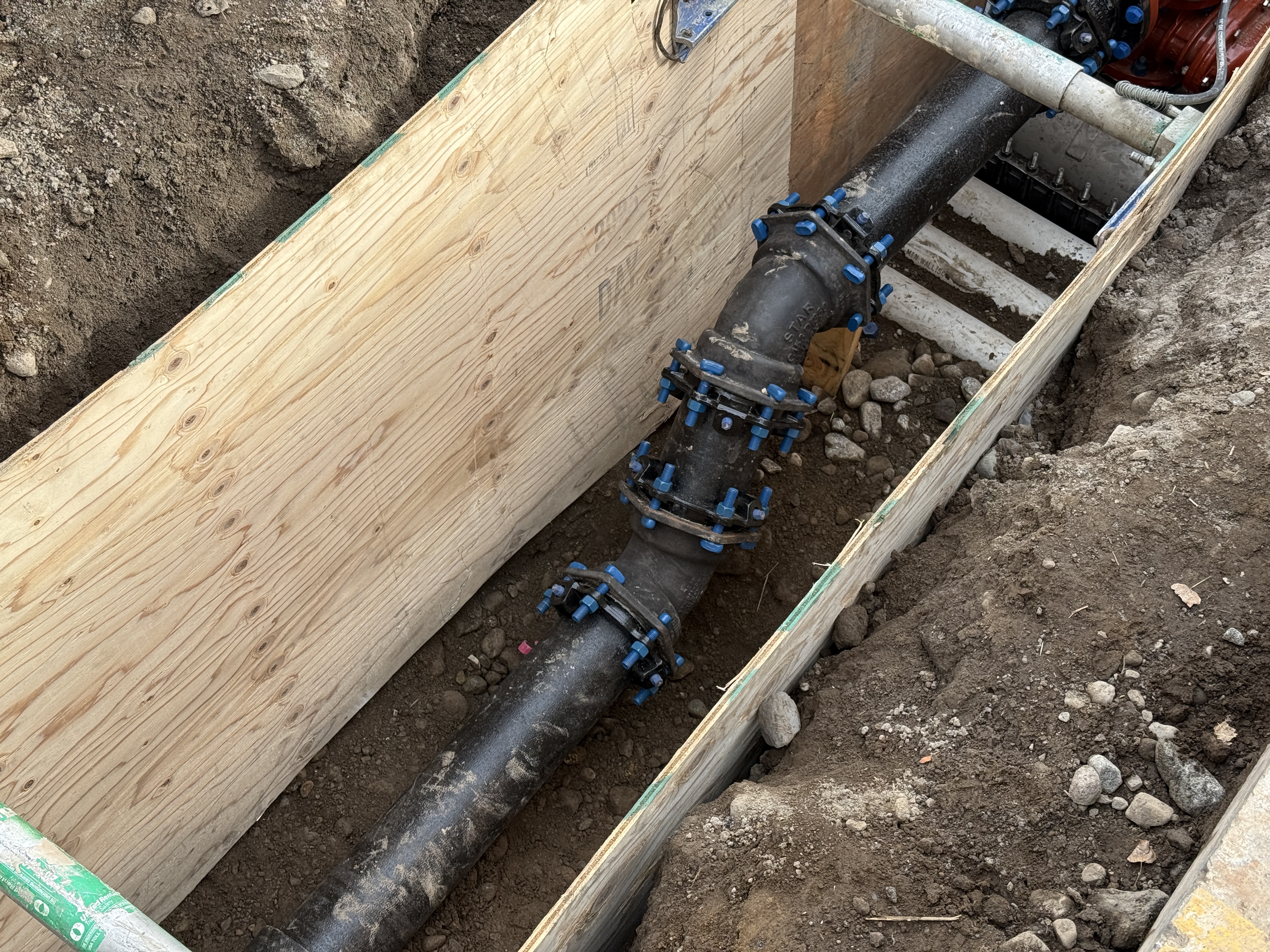 The image shows a section of a trench prepared for underground utility work, featuring a ductile iron pipeline with several blue mechanical joint fittings and connections. Wooden shoring is installed along the trench walls to prevent soil collapse. The project appears to be in the mid-stage of pipeline installation, and no workers are visible at this moment.