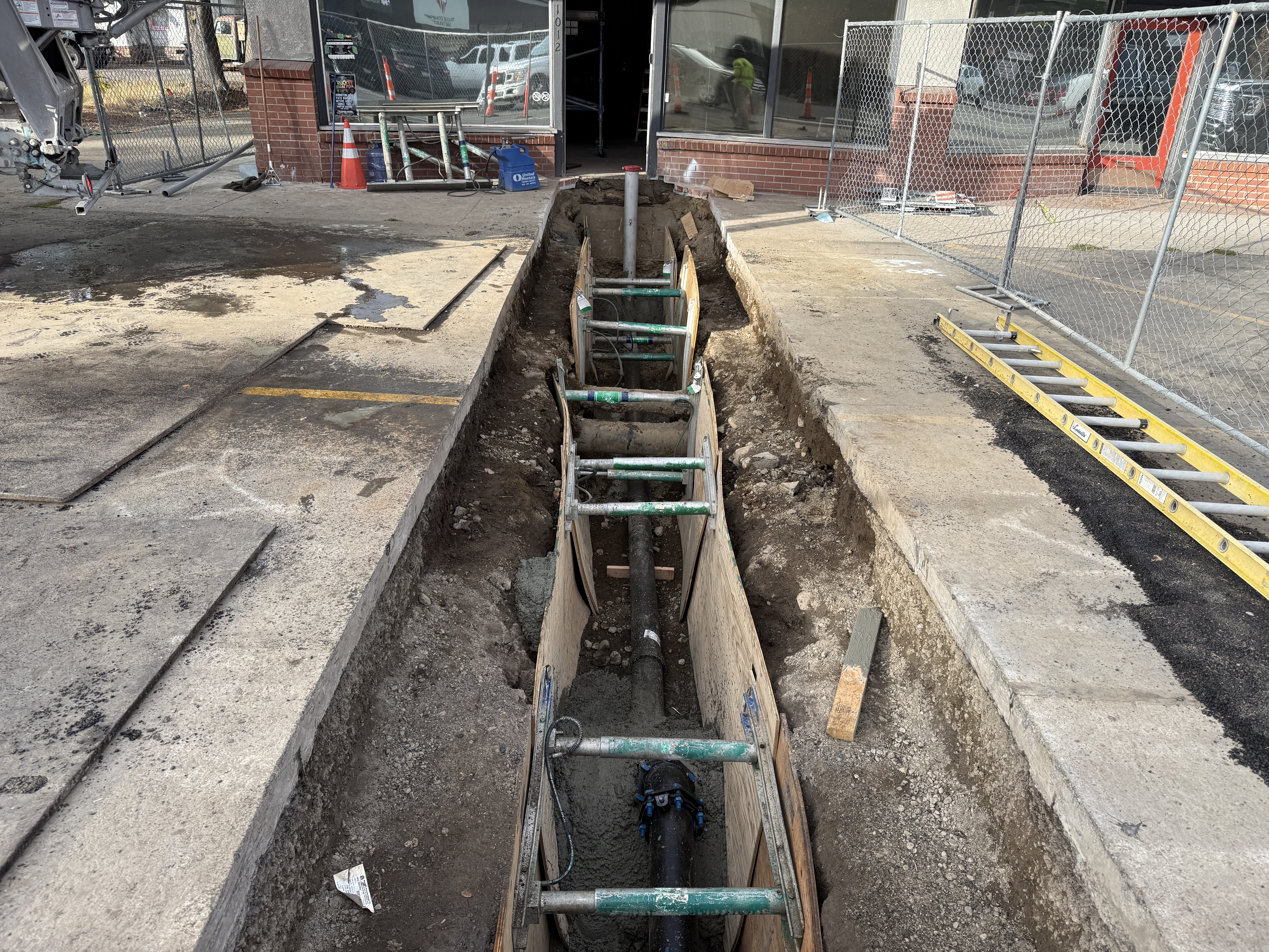 The image shows an active trench excavation with formwork for pipeline installation at an underground utility construction site. A ductile iron pipe with visible fittings is being installed, supported by trench boxes and cross braces. The site appears to be in the middle phase of construction, with concrete used for stabilization around the pipeline.