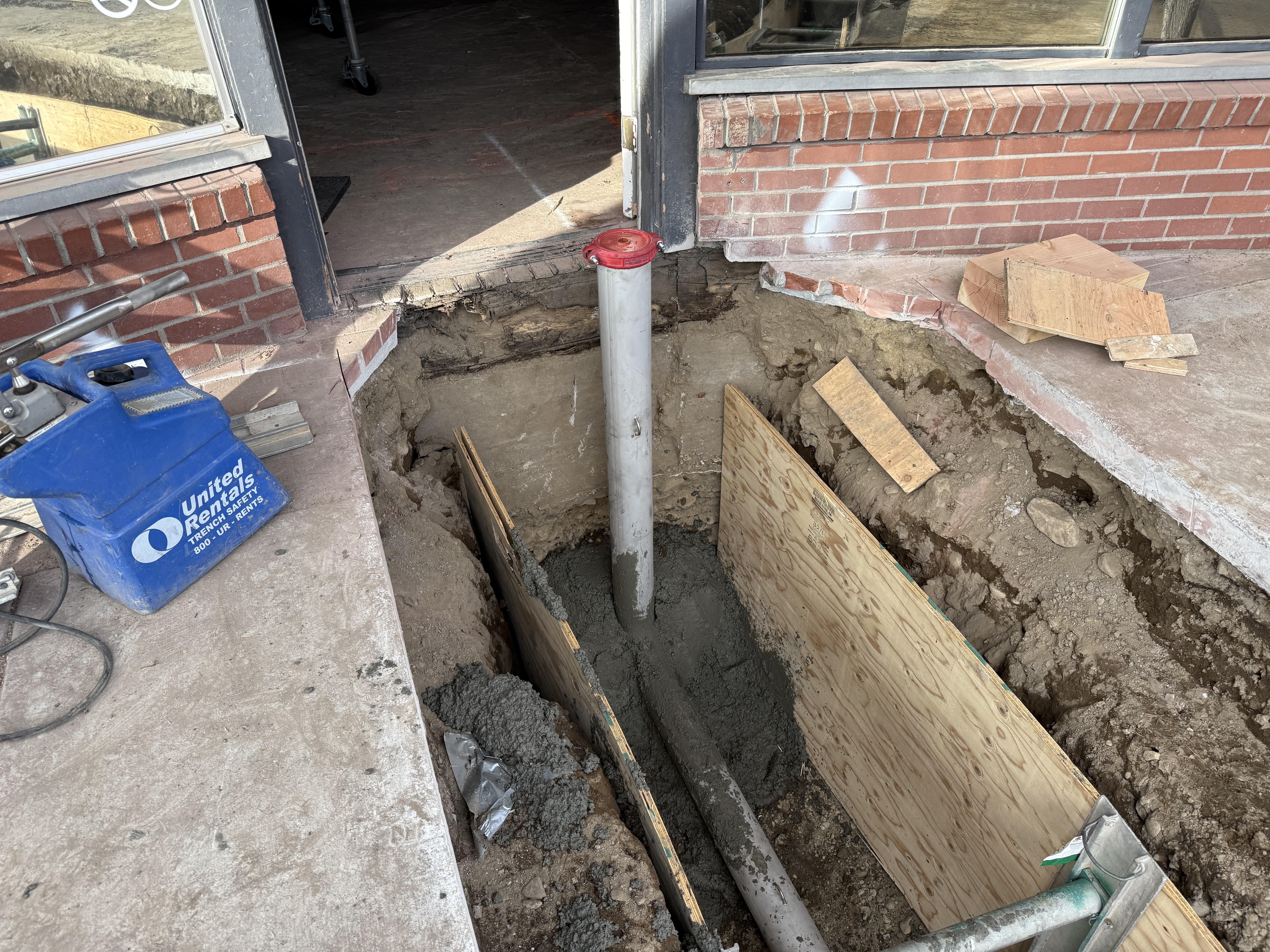 The photo depicts trench excavation work in progress, showcasing the placement of concrete around a vertical pipe with a red cap, indicating preparation for further utility connections. Wooden formwork is used to support the trench walls, and plywood covers lie on the ground. The area is secured, indicating ongoing structural stabilization and utility installation work.