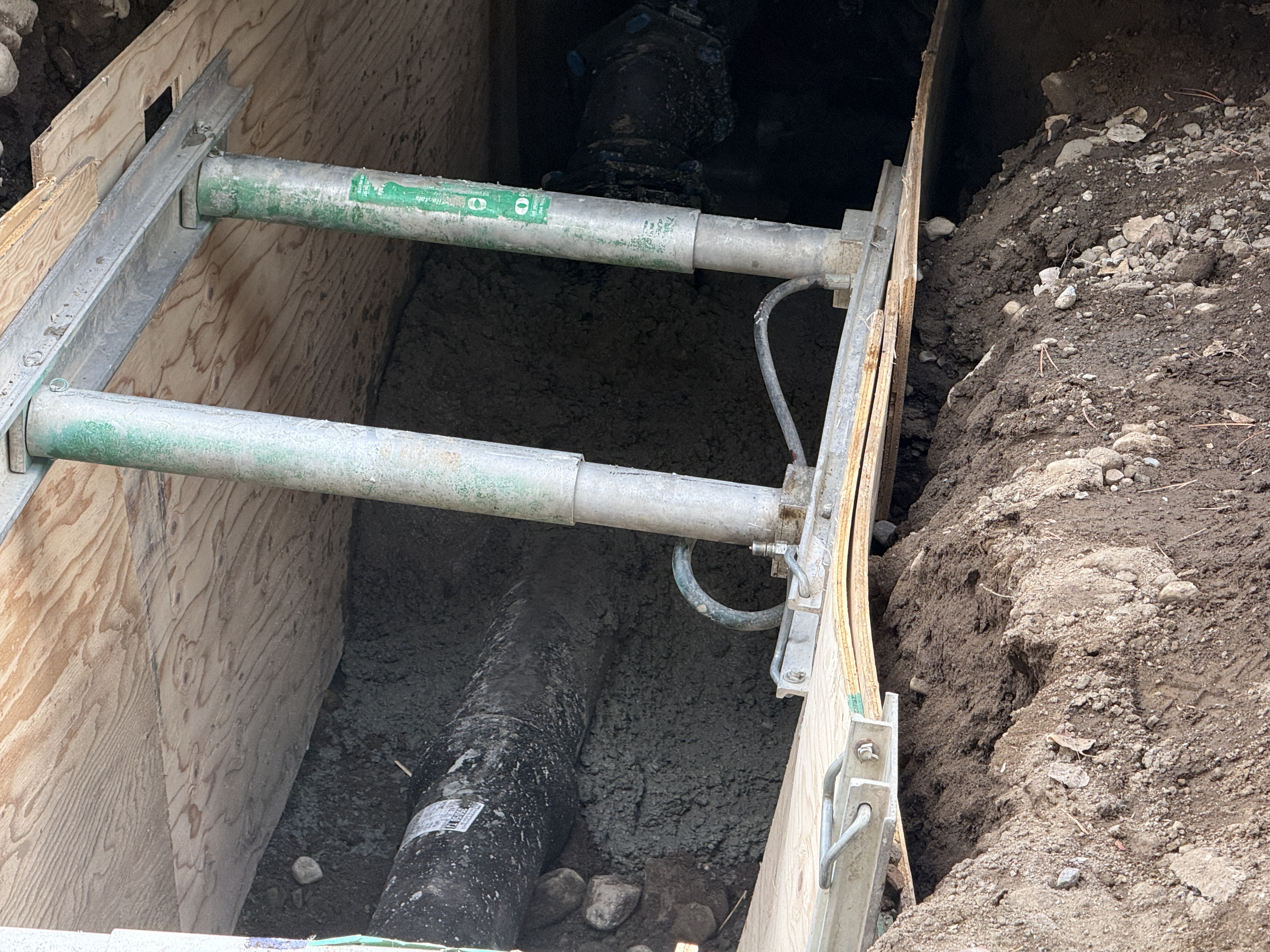 The image shows a trench with shoring panels in place, indicating an ongoing pipeline installation. A ductile iron pipe can be seen laid within the trench, partially surrounded by concrete backfill. Shoring struts are installed to support the trench walls, indicating proper trench safety measures.