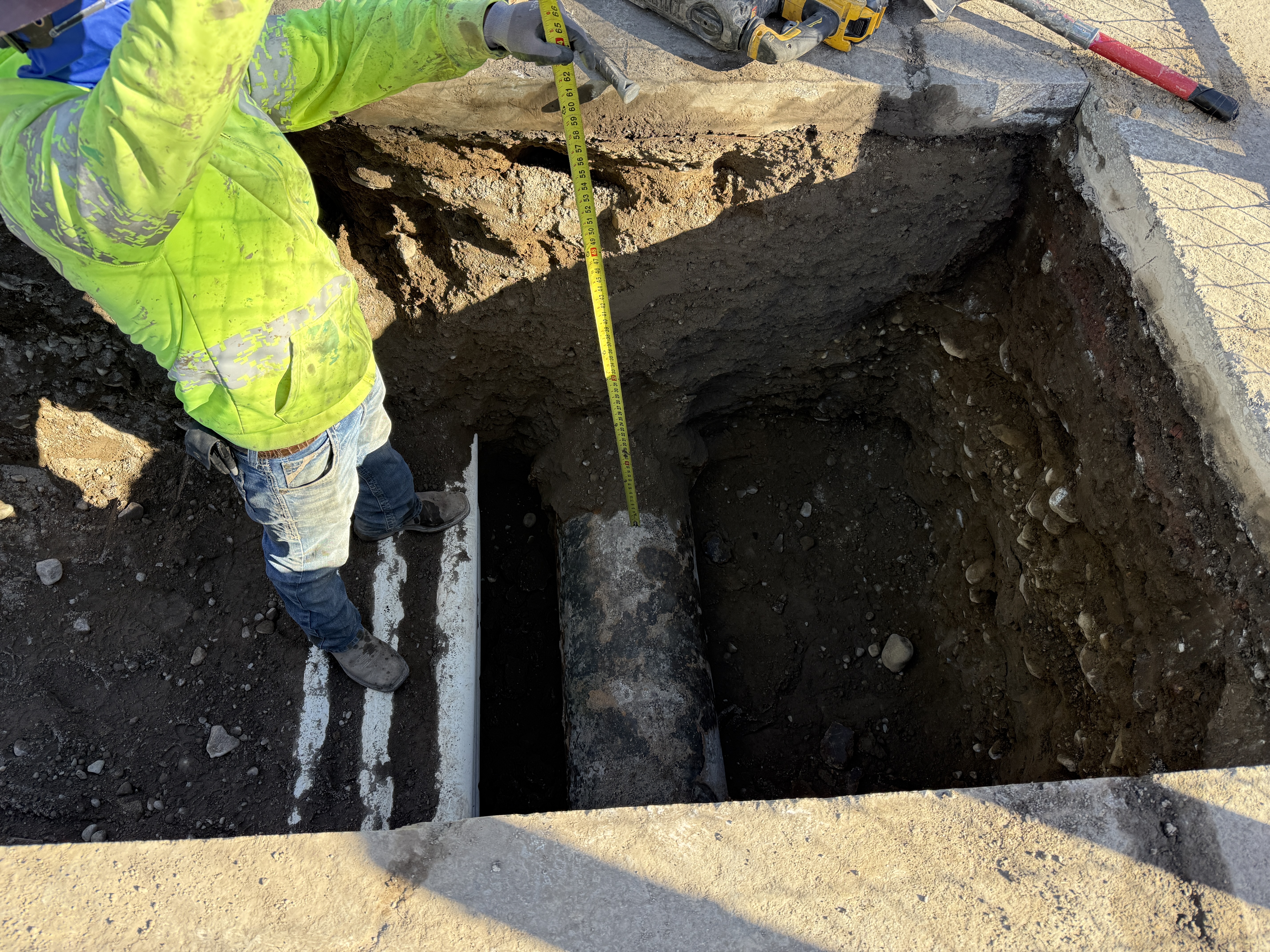 The image shows an individual measuring the depth of a trench that has been excavated around a large diameter pipeline. The pipeline appears to be located underground and is likely part of a water infrastructure project. The individual is using a measuring tape, indicating that this activity is part of the inspection or preparation process for further work on the pipeline system.