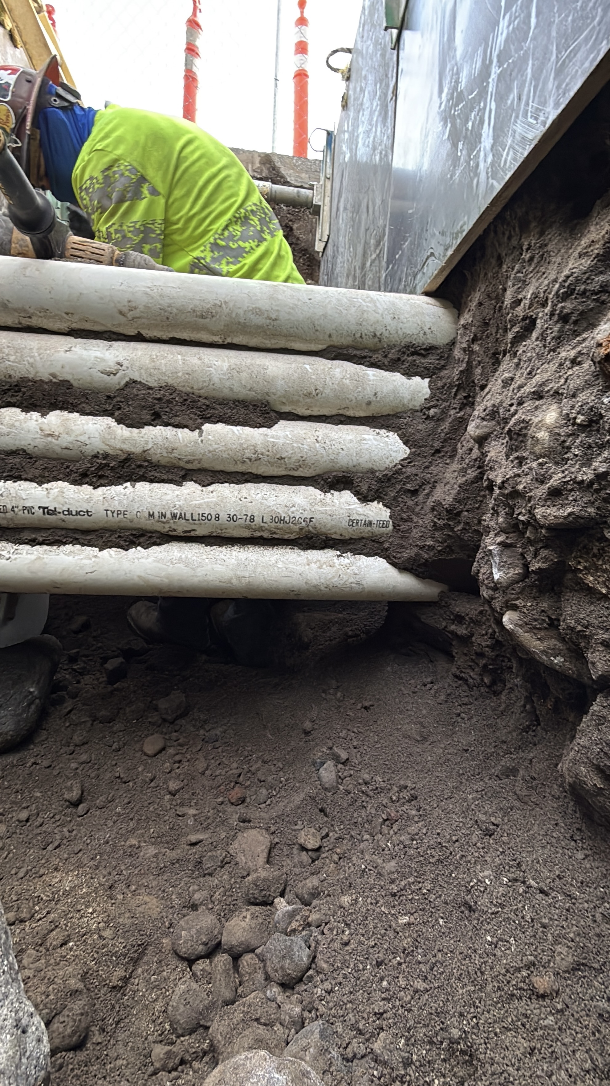 The photo shows a construction worker in the process of installing PVC conduits underground. The worker is positioned in a trench surrounded by excavated soil, and several large conduits are visible, likely for utility purposes. The site appears to be in the mid-construction stage with a focus on laying out utility lines.