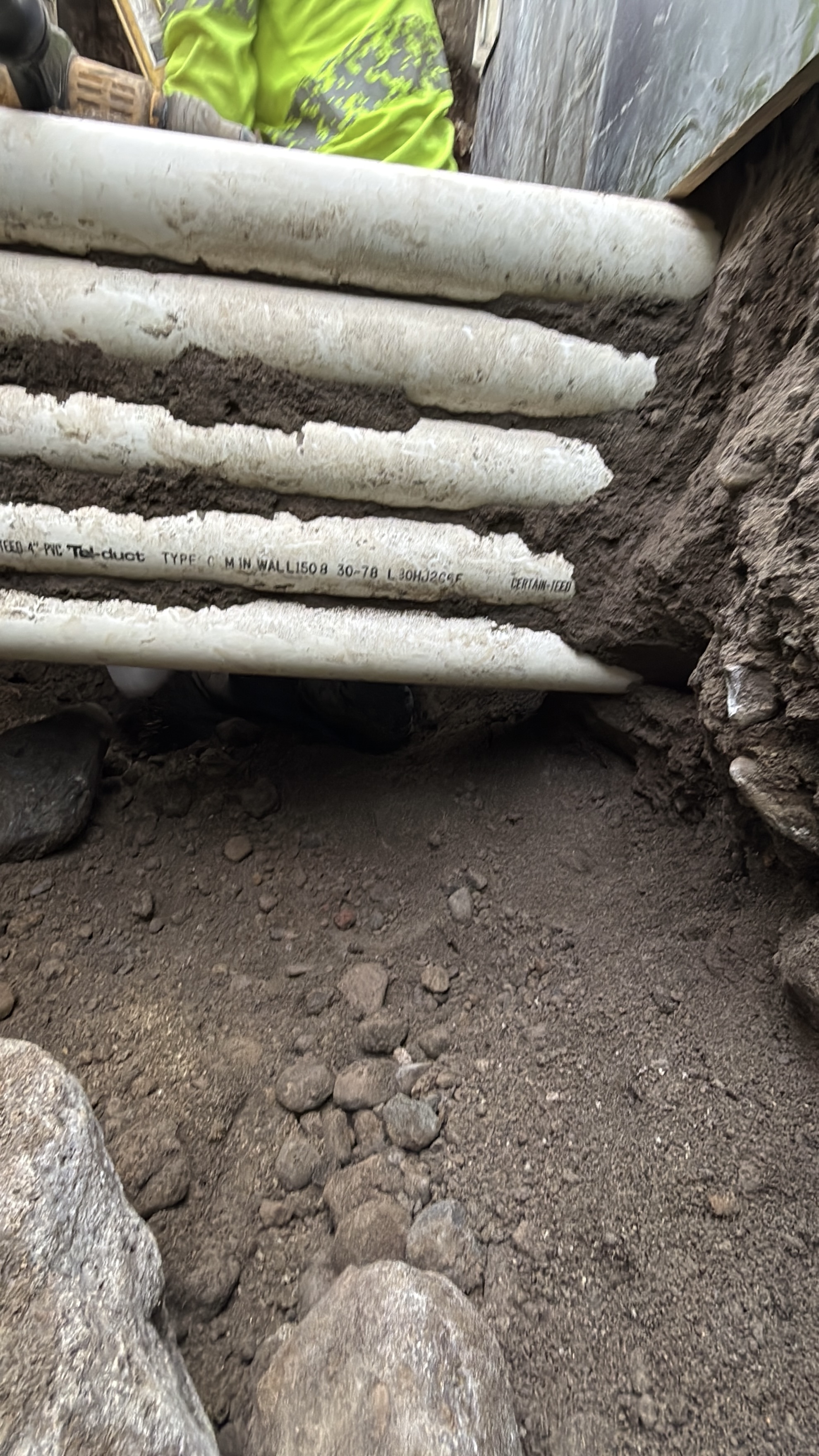 The image shows several PVC pipes stacked horizontally within a trench excavation. The pipes appear to be 4-inch diameter and are likely part of a pipeline installation. The site is in the early stages of construction as indicated by the raw earth surrounding the pipes and lack of backfill. A worker in high-visibility clothing is partially visible, possibly engaged in aligning or securing the pipes.
