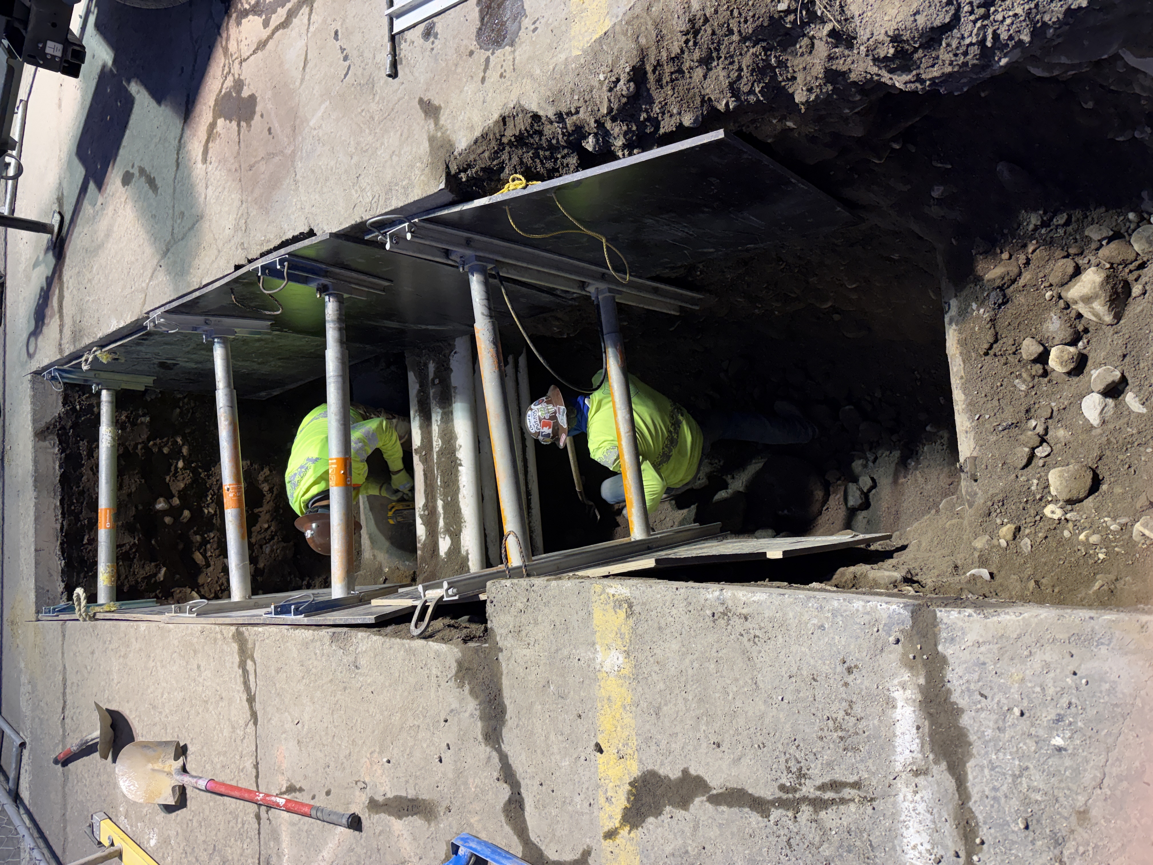 The image shows two workers inside a shored trench working on what appears to be an underground utility installation. They are interacting with the soil and possibly existing pipelines, indicated by the tools and the visible pipe sections. The trench is supported by a trench box, and spoil is piled up on the sides, showing active excavation work.