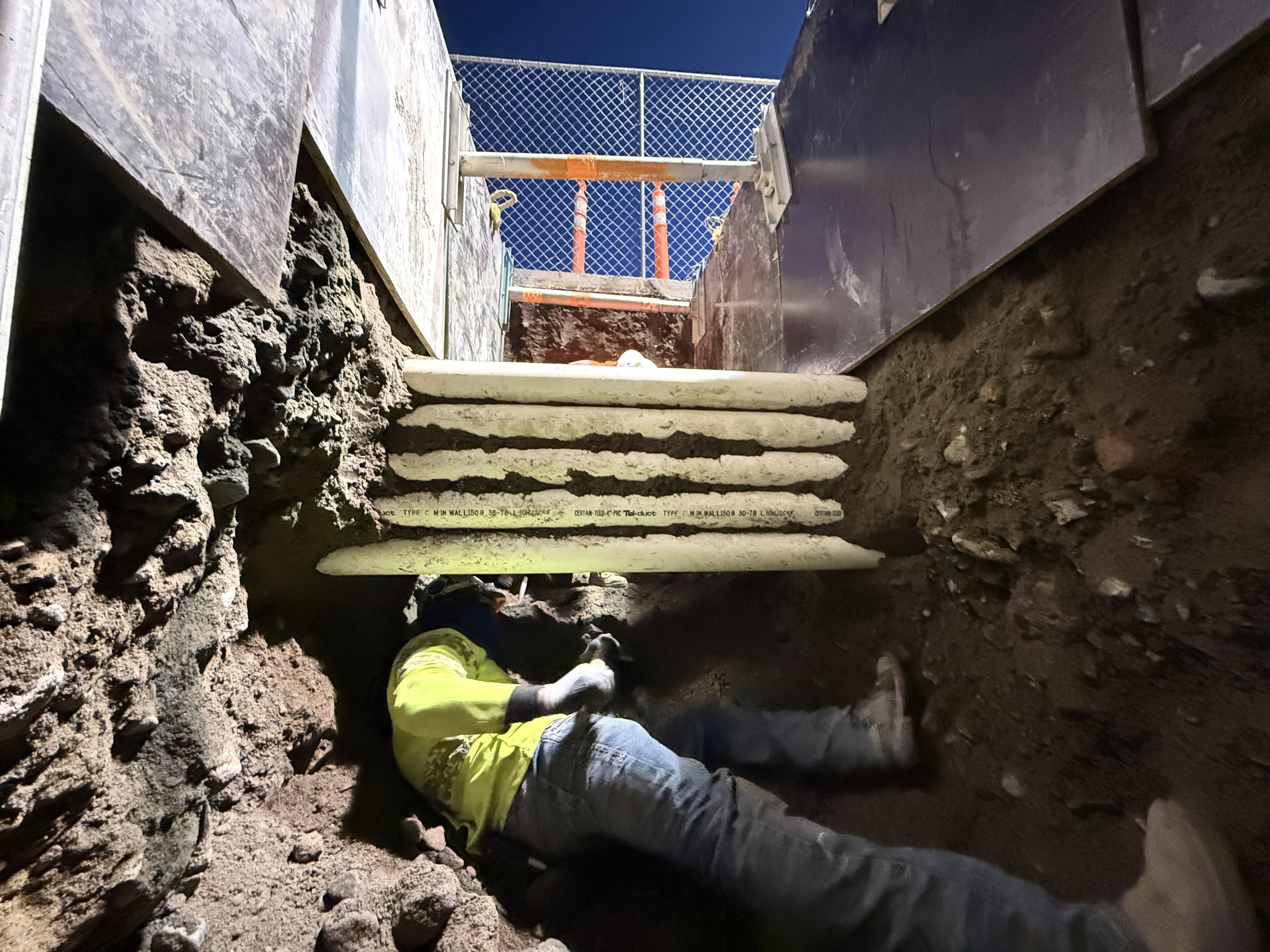 A worker is inspecting or laying multiple white PVC pipes in a trench shored with metal trench boxes. The trench appears to be part of an underground utility installation project, with compacted soil surrounding the pipes and the trench walls. The setup suggests a mid-phase of utility pipeline installation, focusing on proper pipe alignment beneath site barriers.