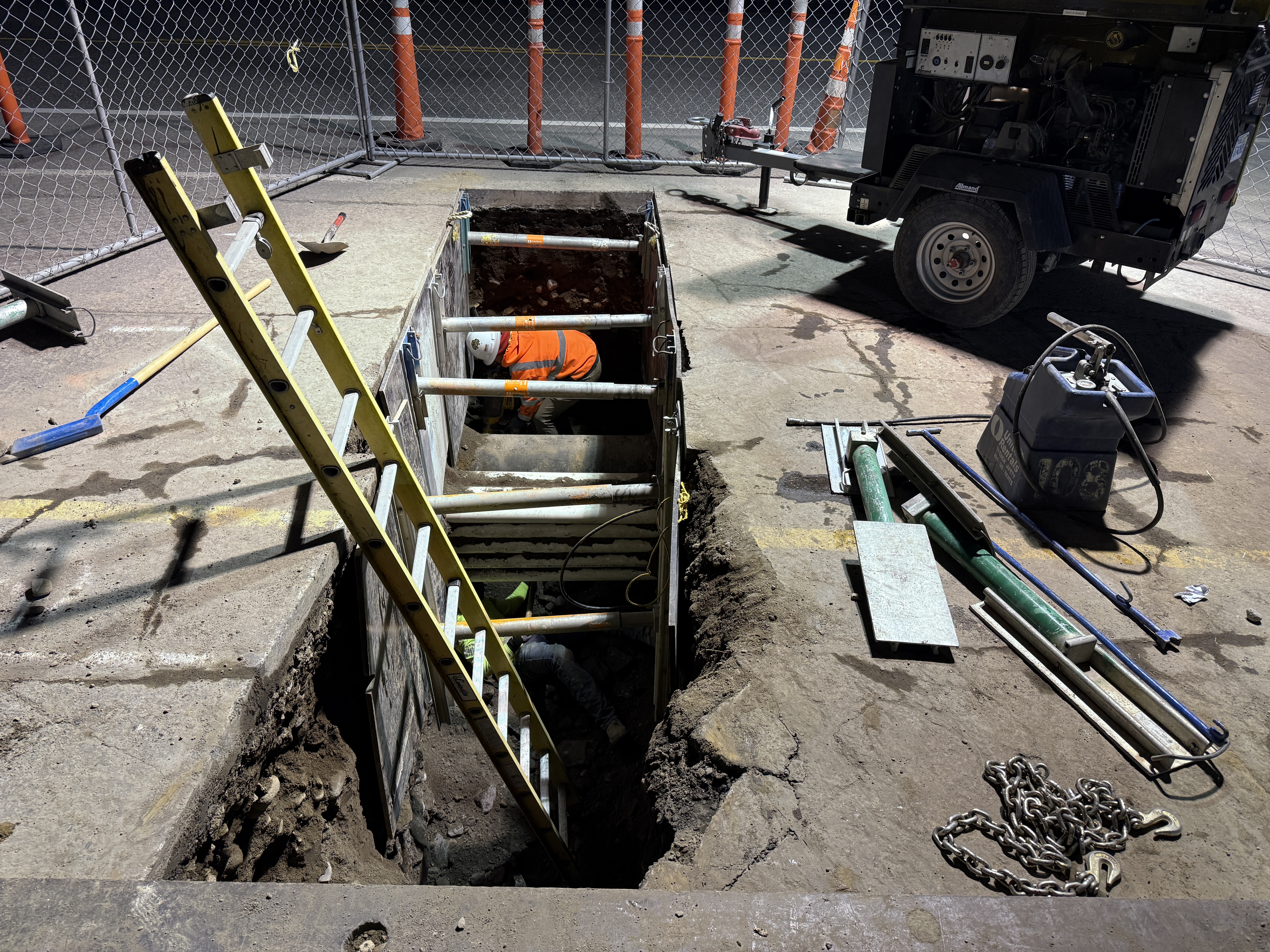 The photo shows an active construction site with a trench excavation in progress. A worker is visible inside the trench, which is supported by shoring to prevent collapse. A ladder provides access to the trench, and various tools and equipment are positioned nearby, including a portable generator and hydraulic pump. The site is illuminated, indicating work is likely occurring during nighttime under artificial lighting.