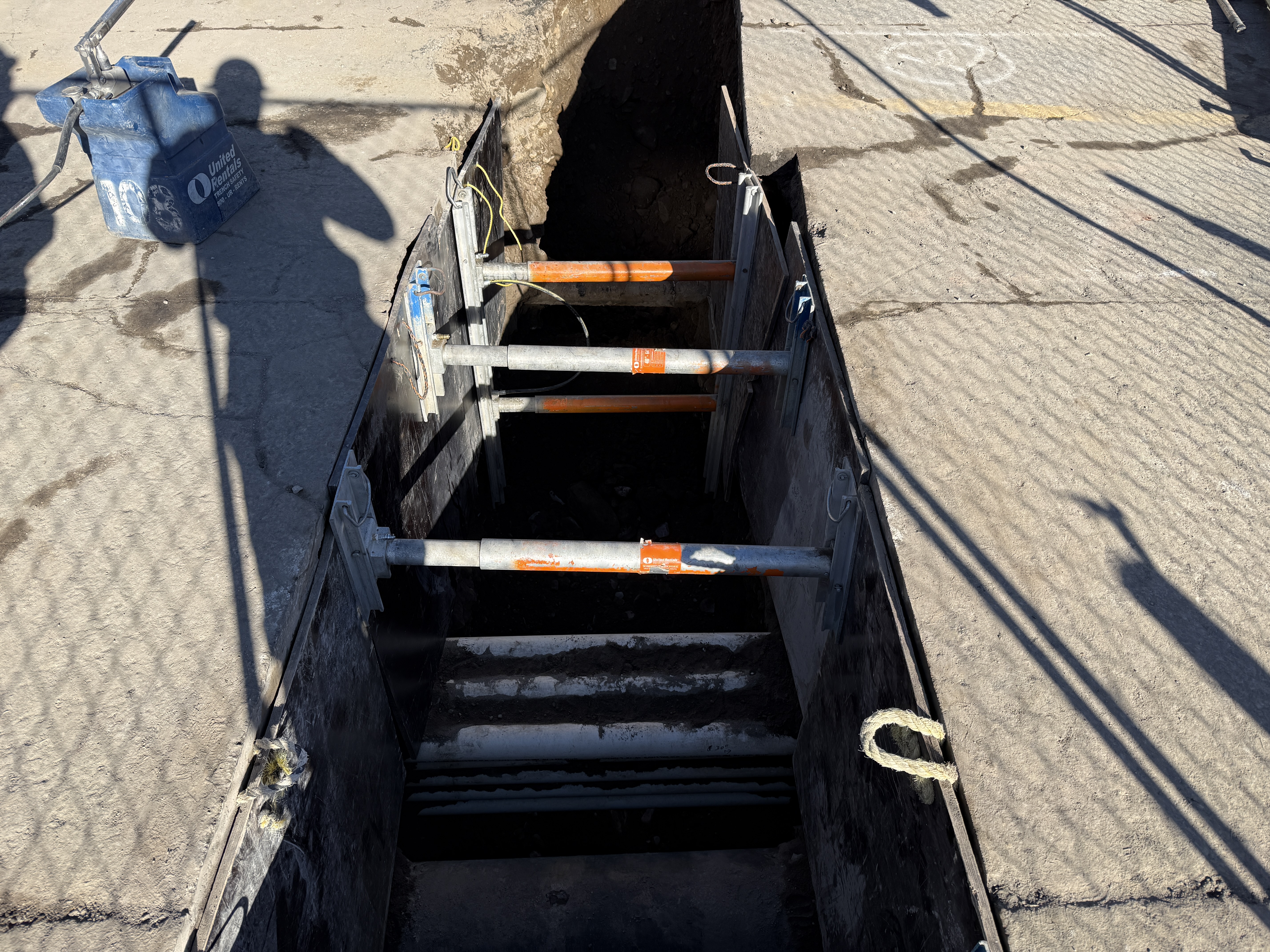 The image shows a trench with hydraulic shoring installed to prevent wall collapse, indicating active excavation work. The trench is prepared presumably for utility installation, with metal cross braces providing structural support. The surrounding pavement shows signs of previous cuts and the area is roped off with temporary barriers.