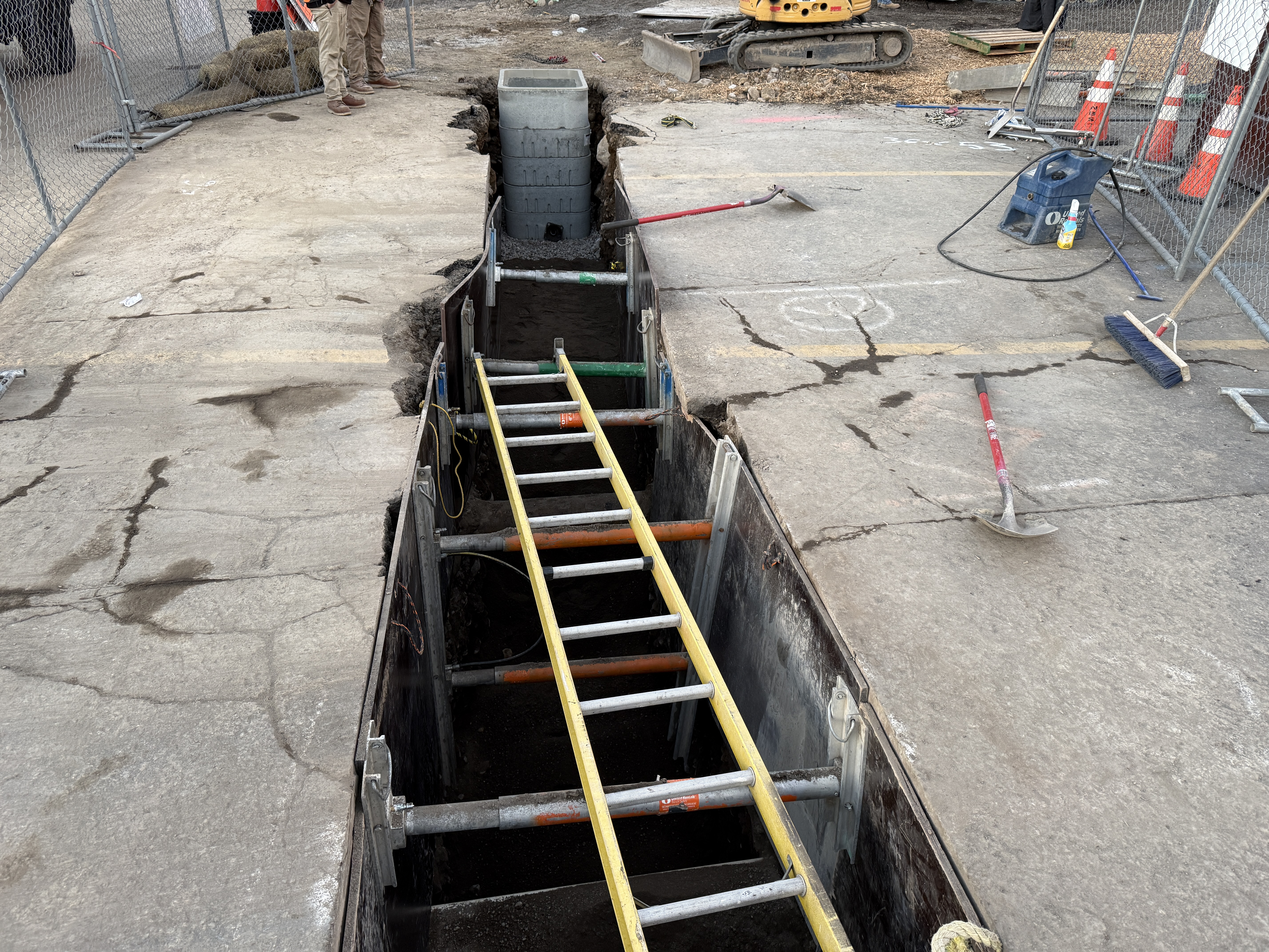 Workers visible with PPE including hard hats and boots, proper trench shoring implemented, safety barriers include fencing and cones around work area.
