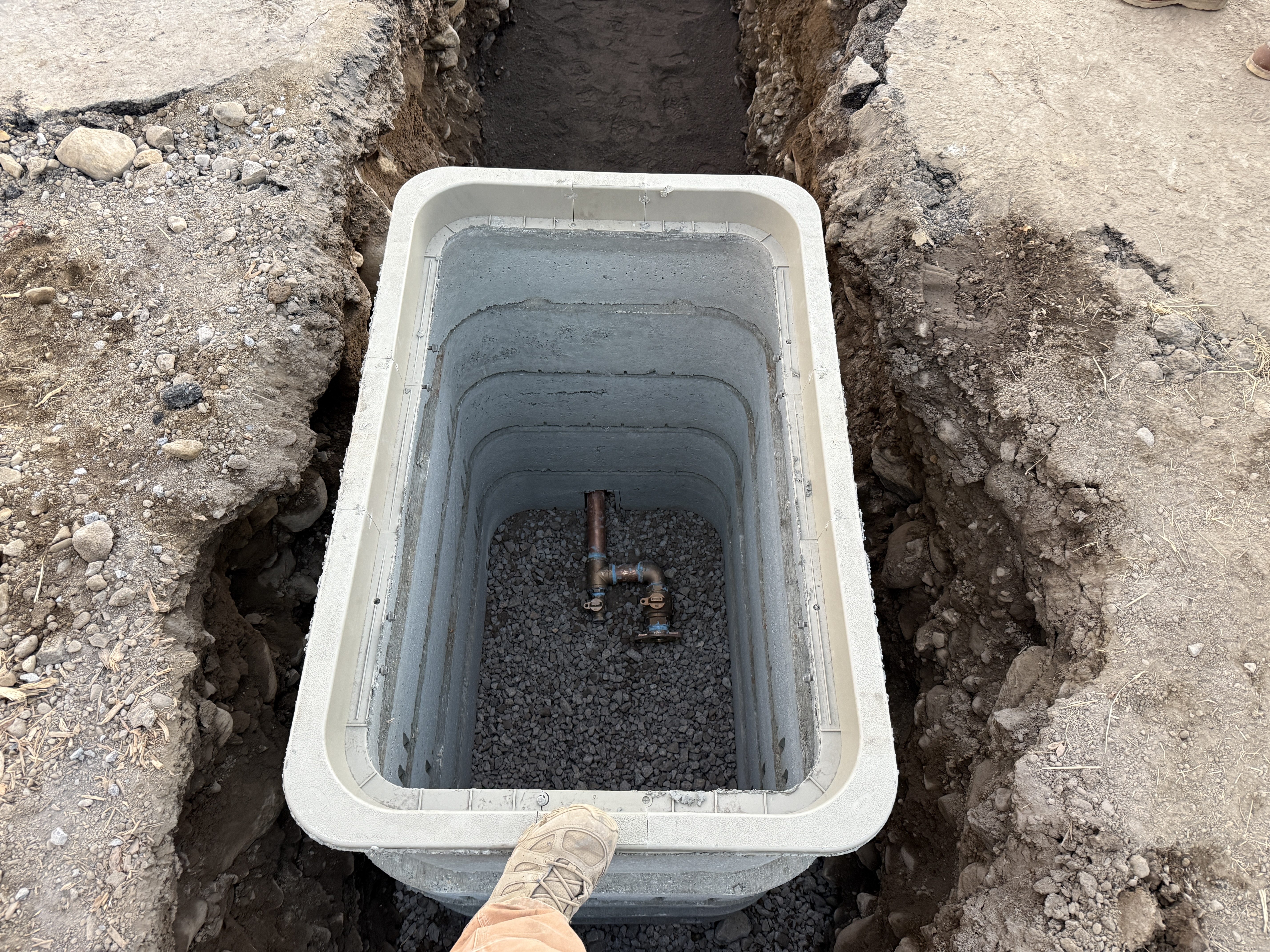 The image shows a partially installed underground valve vault with concrete forms in place. The trench is excavated, and gravel bedding is present at the base. Copper pipe fittings and valves are visible inside the vault, indicating mid-construction phase for water utility infrastructure work.