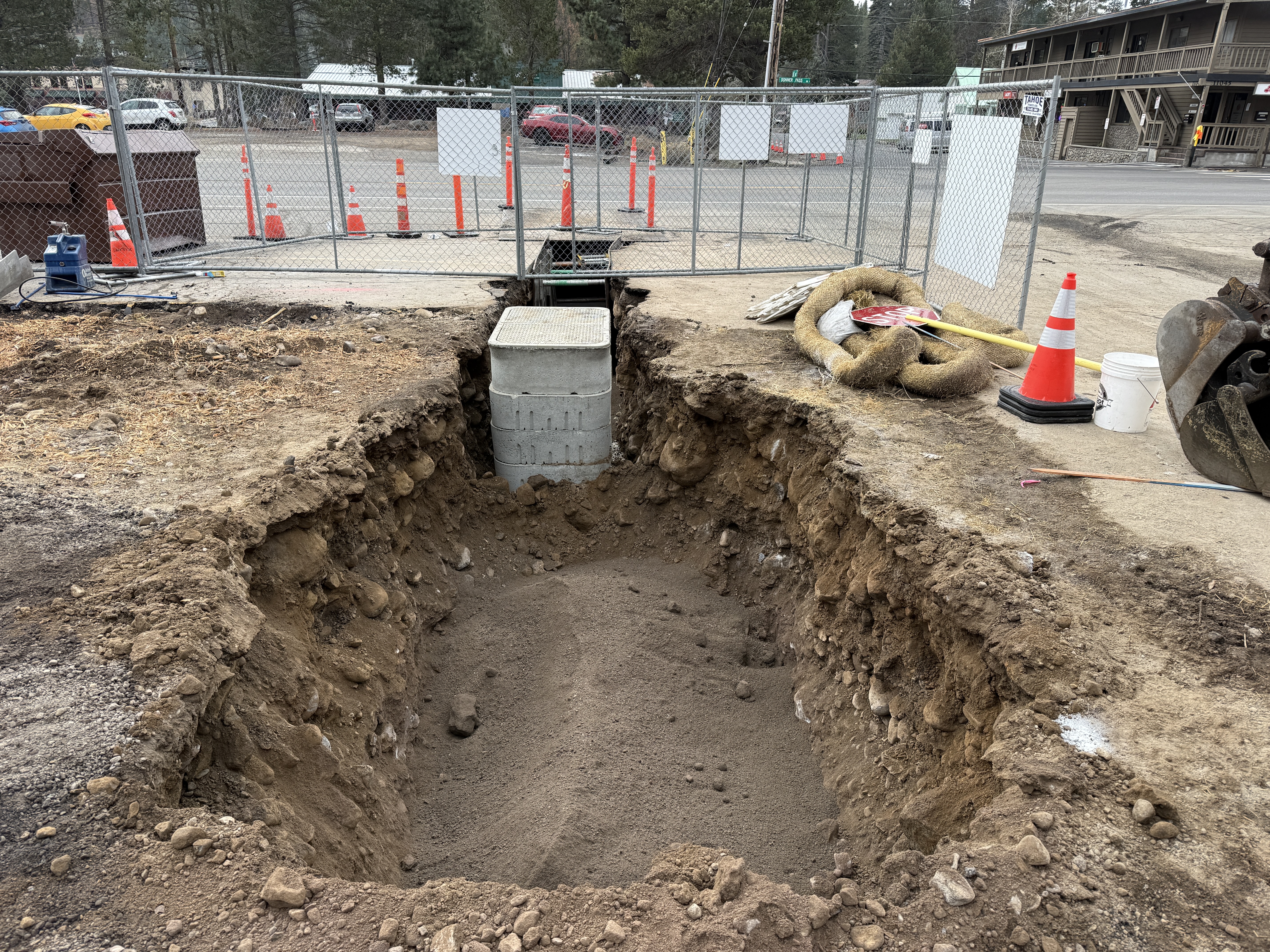 The image shows an excavation site with a trench being prepared for underground utility work. A concrete vault is partially installed, likely intended for housing valves or other utility components. Traffic cones and coiled erosion control materials are present, suggesting active site management for safety and environmental compliance.