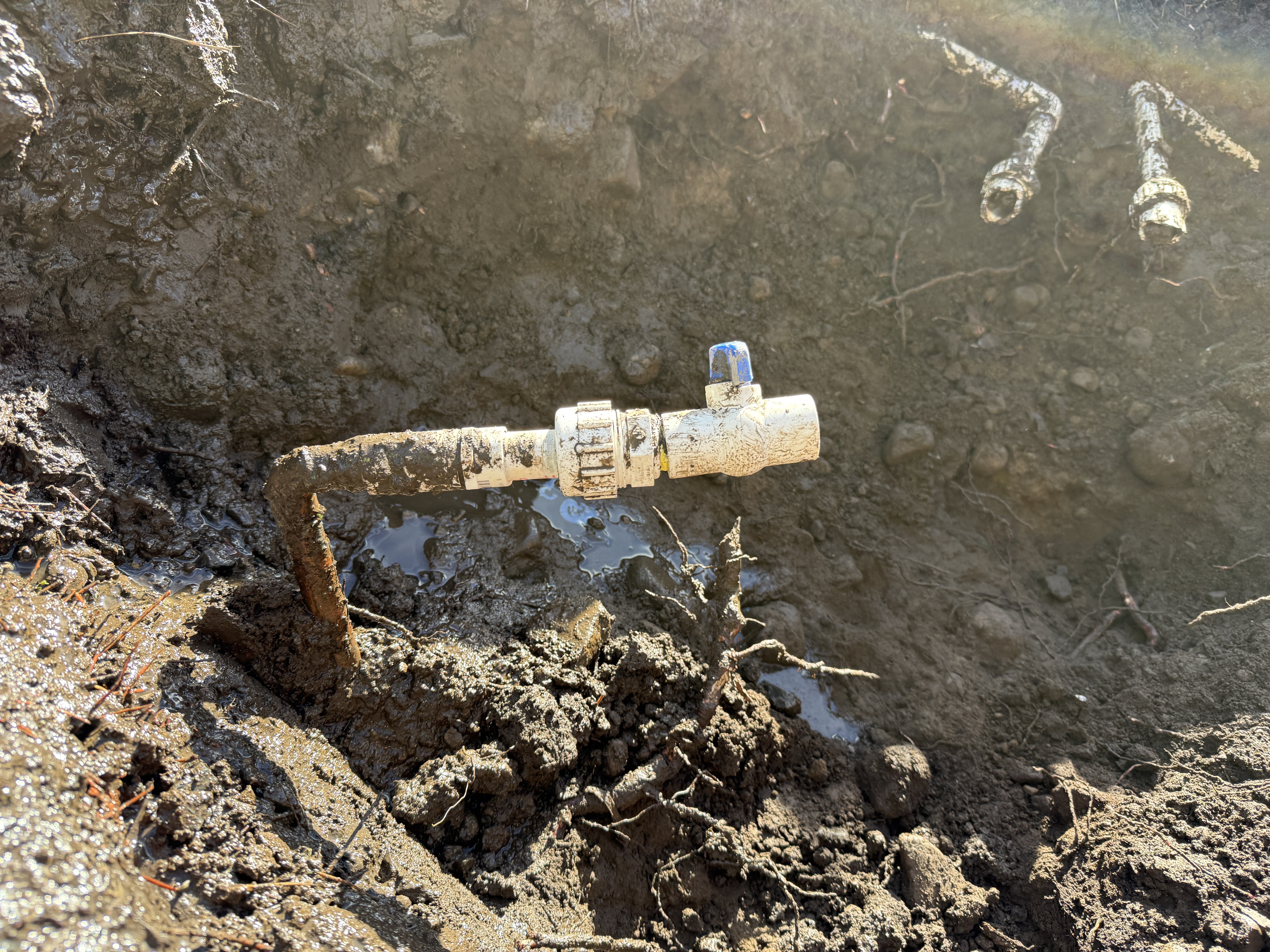 The photo shows a section of underground piping with exposed metal pipes rising from the ground. There is a visible valve, likely used for controlling water flow, attached to the piping. The area is muddy and shows signs of active excavation work, indicating early to mid-stage construction involving water infrastructure installation.