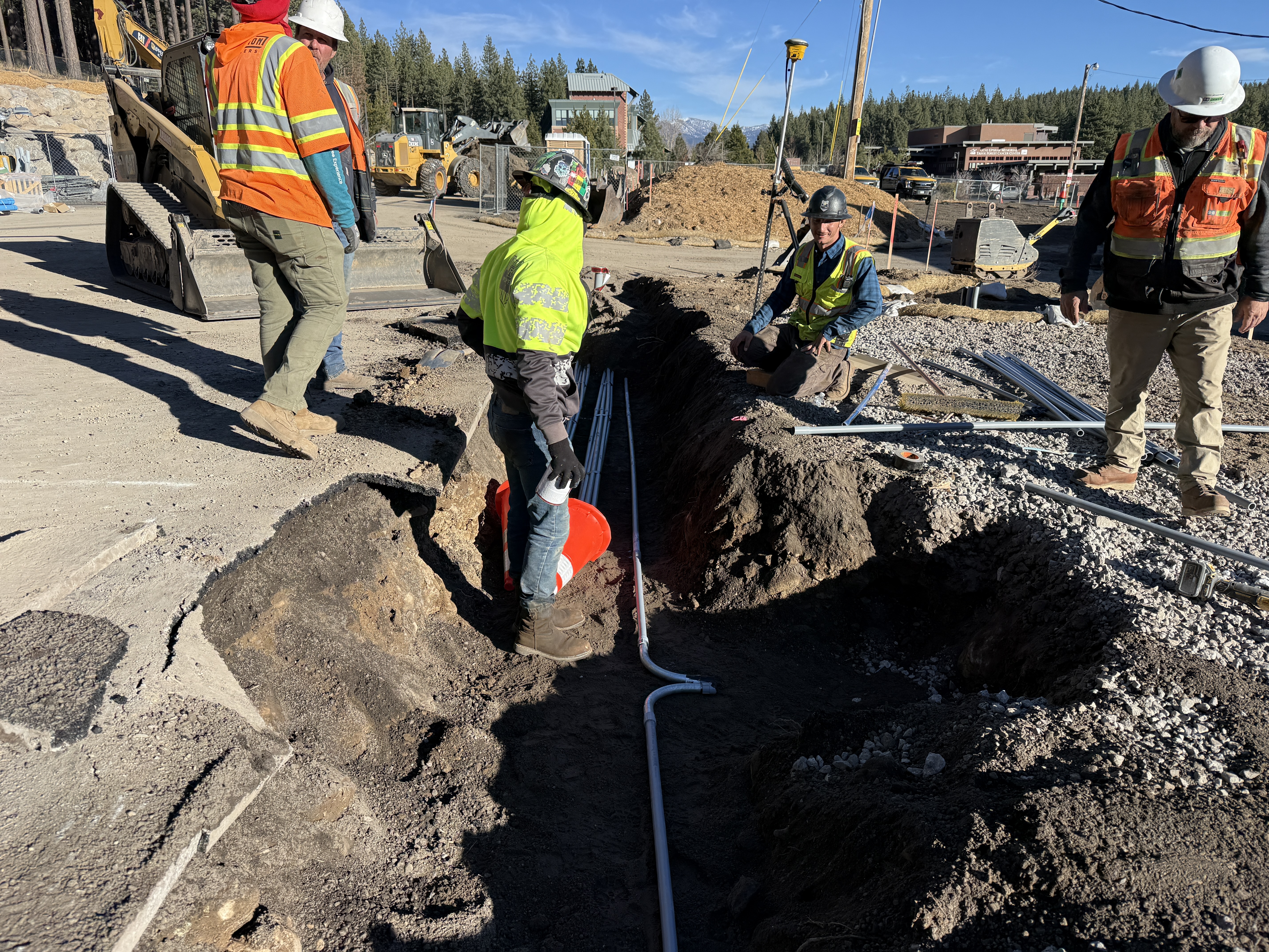 The image shows construction workers installing electrical conduits in a trench as part of underground utility work. Workers are using shovel and hand tools to position conduits and ensure proper alignment. The trench has been excavated to lay the conduits, and a compacted gravel layer is visible. The stage appears to be early in the underground conduit installation process.