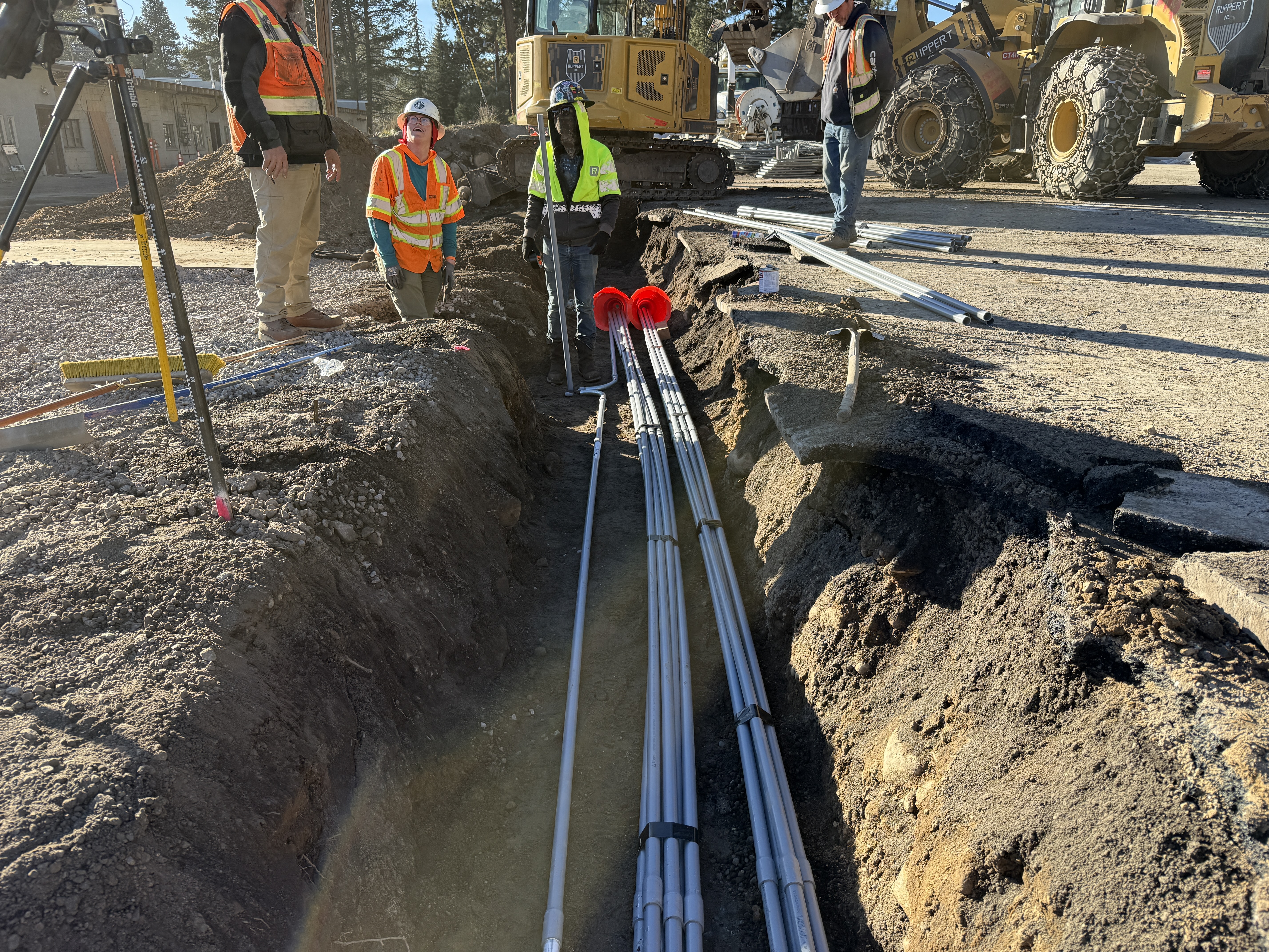 The photo shows workers in an active construction site engaged in underground utility work. Multiple electrical conduits are being installed within a trench, indicating progress in the pipeline-installation phase. The conduits appear to be organized and staged for connection or further installation. The site is equipped with heavy machinery visible in the background, facilitating the construction process.