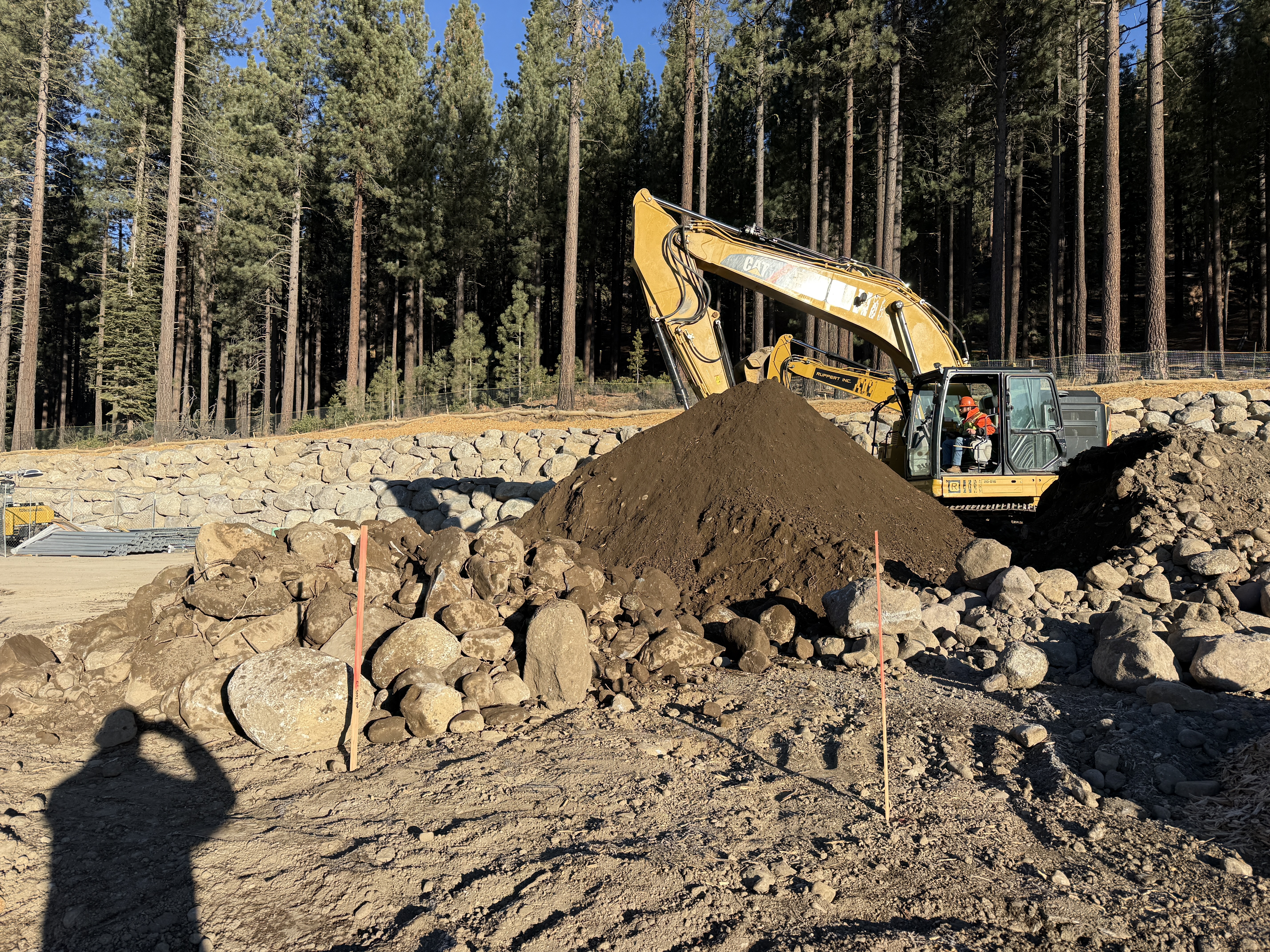 The photo shows an active excavation site with a CAT excavator moving a pile of soil, indicative of earthmoving activities. Large rocks are scattered across the site, likely being sorted or removed as part of site preparation. The construction is at an early to mid-phase, with the area being cleared and leveled, possibly for future pipeline installation or foundation work. The surrounding environment is a forested area, with a retaining wall partially visible in the background.