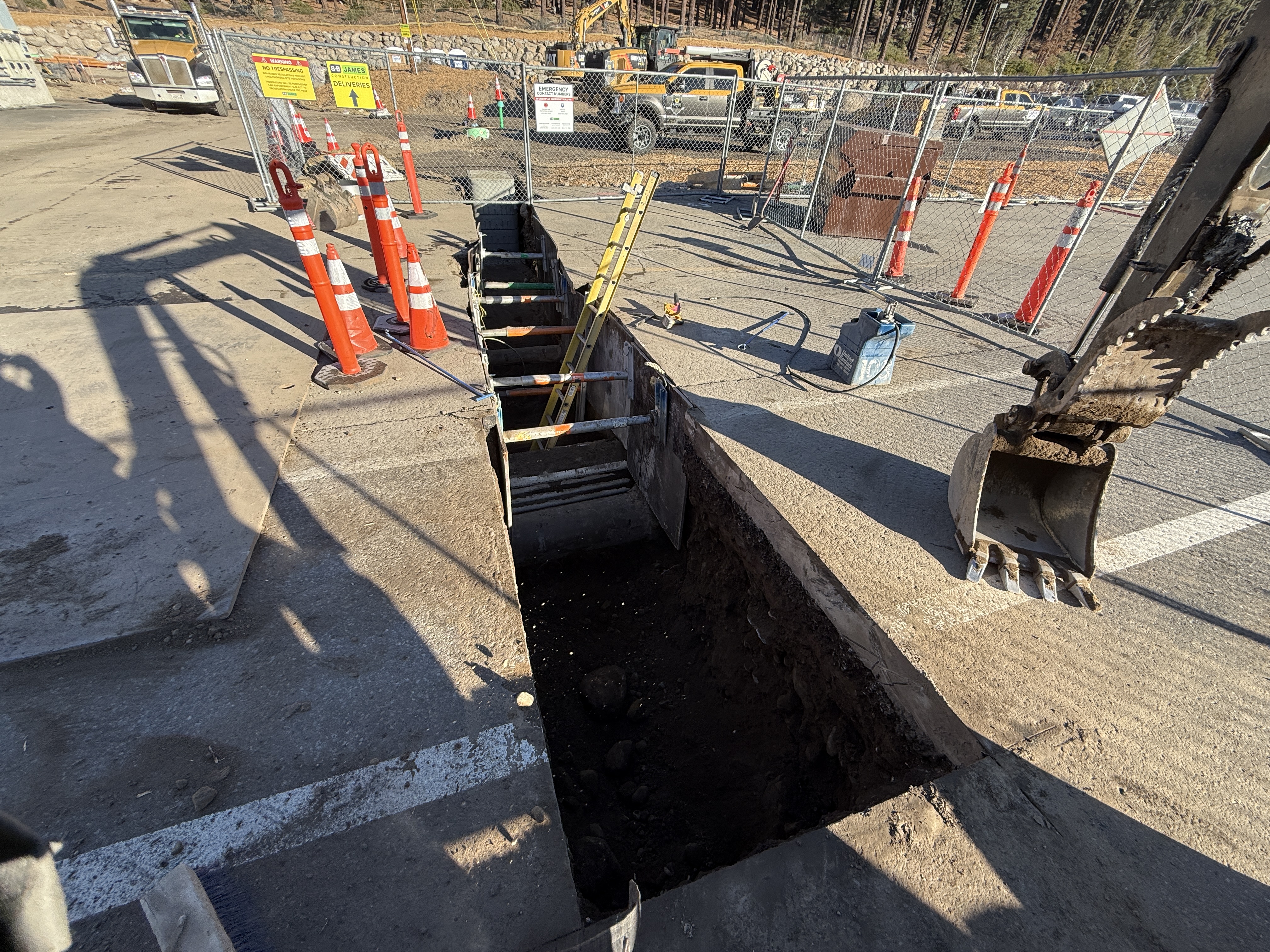 The photo shows a trench excavation in progress for a water infrastructure project. Safety cones and a fence are visible delineating the work area, and an excavator is present for digging operations. Ladders provide access into the trench, which is lined with shoring for stability. The work appears to be in the early stages, with trench excavation underway.