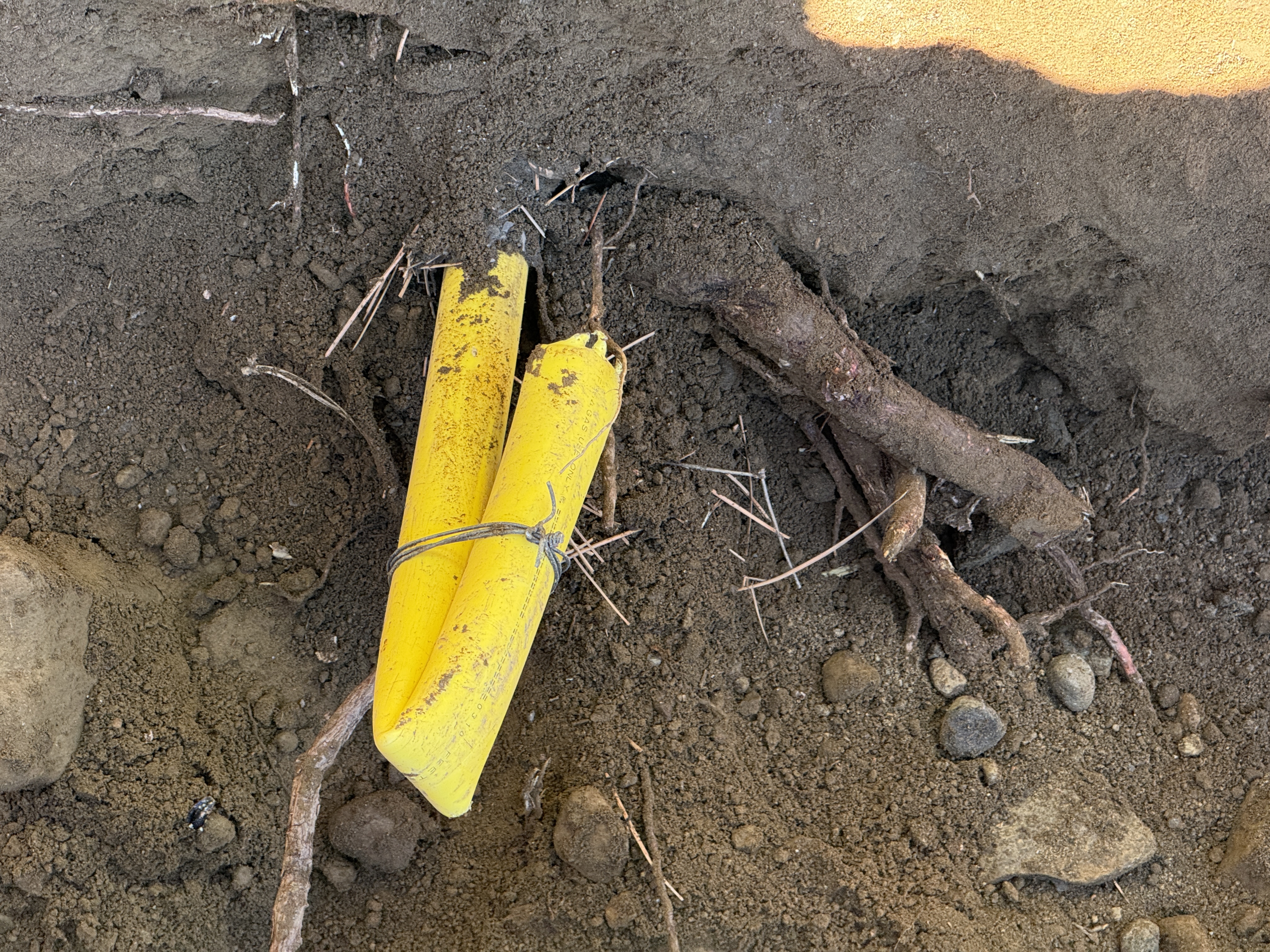 The image shows a section of exposed earth with a yellow protective conduit lying on a dirt surface, partly buried, possibly meant for encasing pipes or cables. A root or small branch is entangled with the conduit indicating recent trench excavation activity for utility installation. The construction is likely at an early stage as the trench appears recently dug and unfilled.