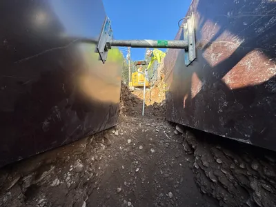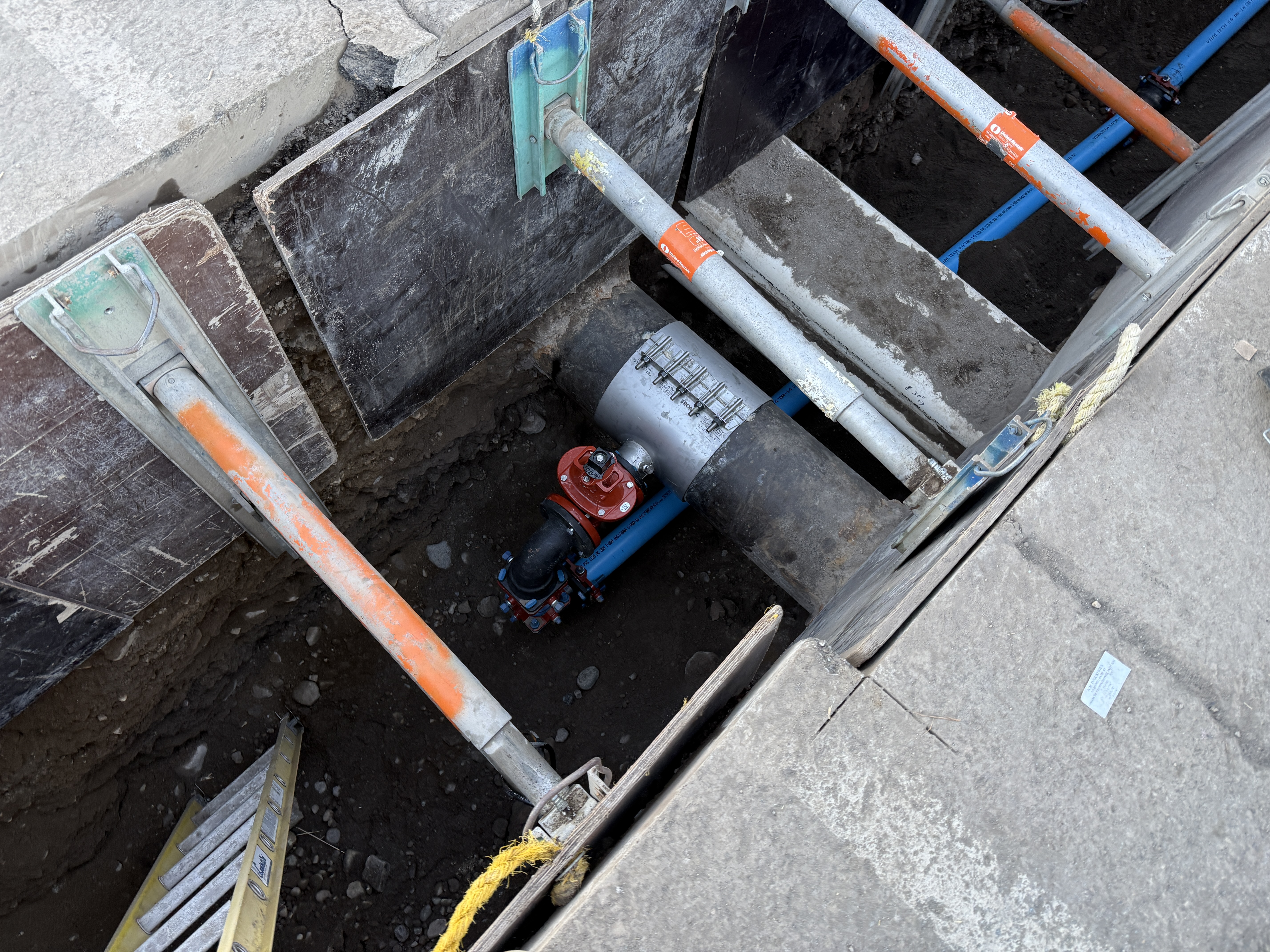 The photo shows an underground pipeline installation in progress within a shored trench. Visible are a red valve and associated fittings connected to a blue plastic pipe, which suggest work on a water line. The trench is supported by metal shoring equipment to prevent collapse, indicating it's in the mid-stages of construction.