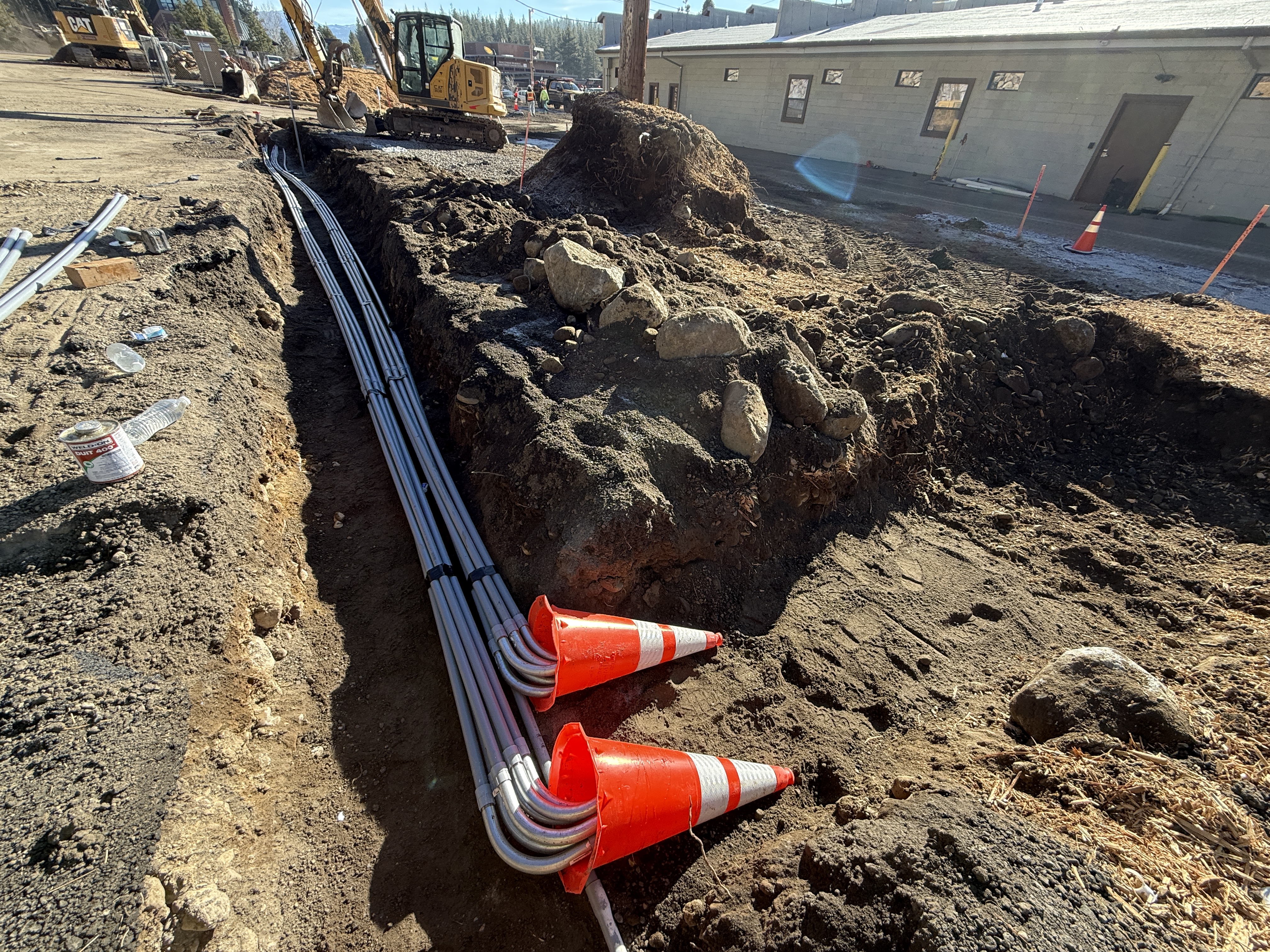 The image shows electrical conduit installation in a trench equipped with multiple PVC pipes running parallel. The trench appears freshly excavated, with soil and rocks piled nearby. Large construction equipment, like excavators, is visible in the background, indicating active trenching work. Safety cones cover the pipe ends, showing attention to safety and visibility.