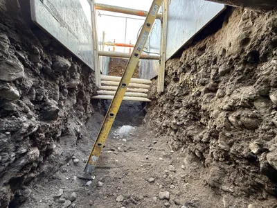 Worker is wearing a hard hat. Trench boxes are installed for safety. No other PPE clearly visible in frame.