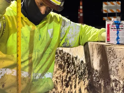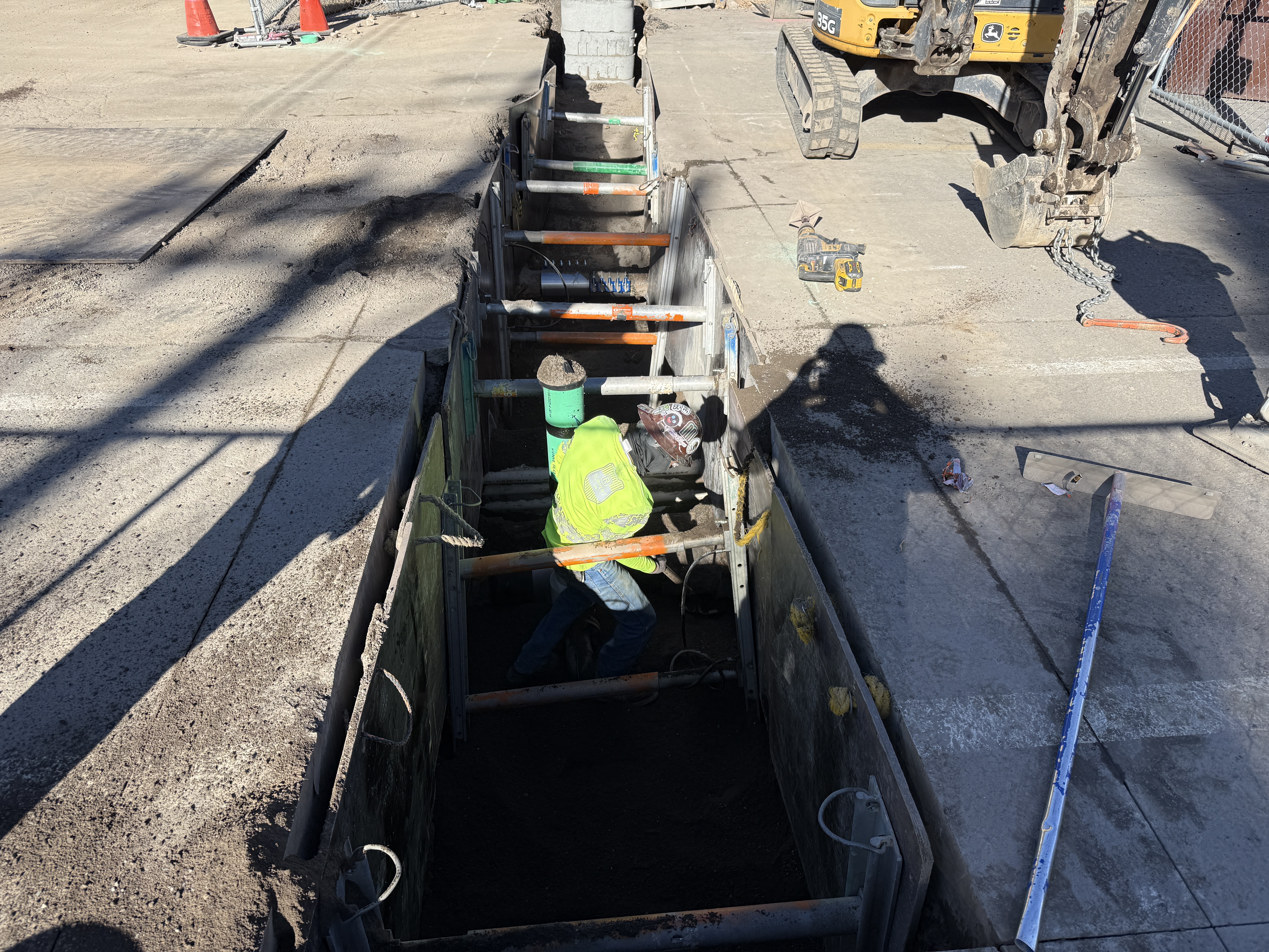 The photo depicts a trench excavation with a construction worker engaged in underground utility work, likely pipeline installation. The trench is supported by shoring to prevent collapse, and the worker is using hand tools. An excavator is positioned nearby, indicating active soil removal or trenching operations.