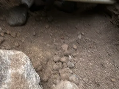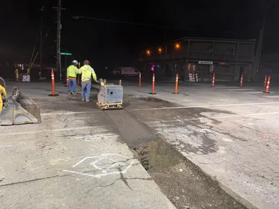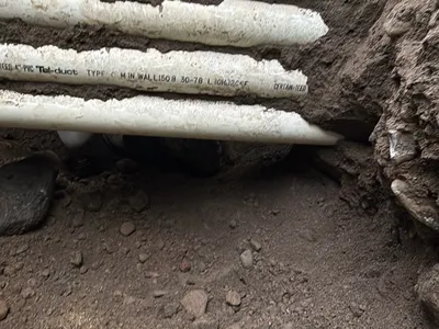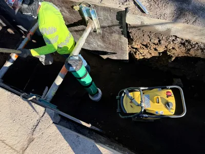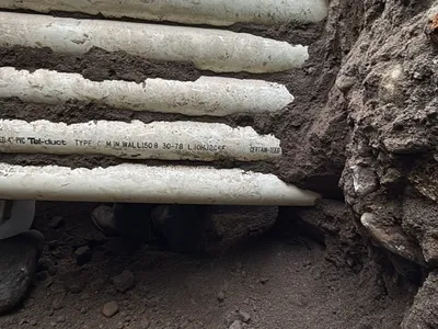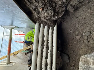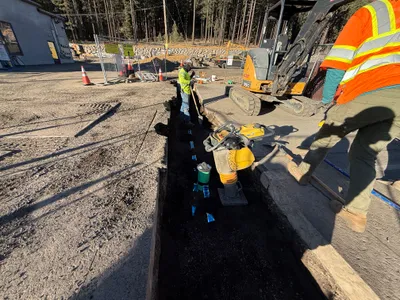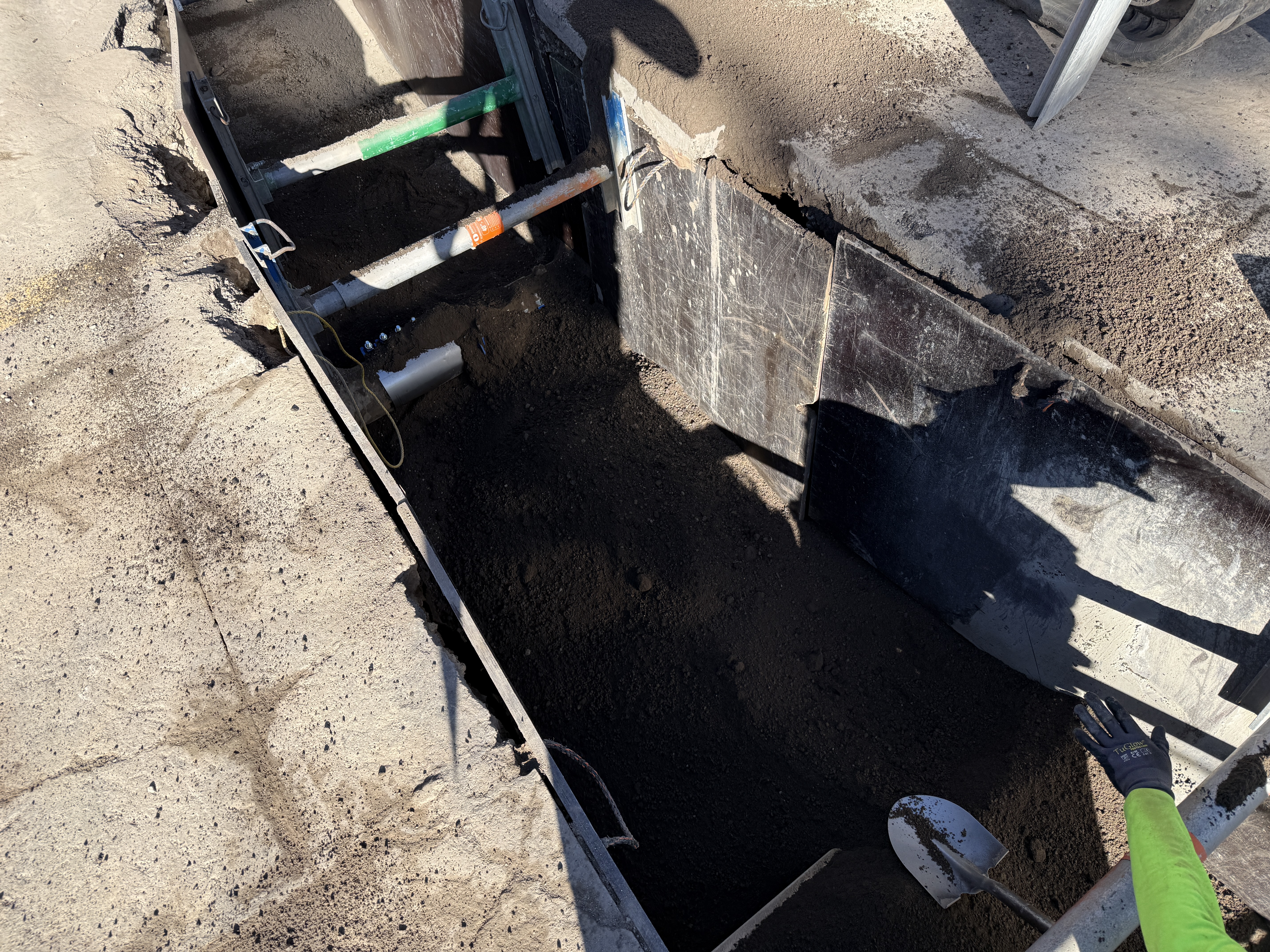 The image shows an open trench excavation in progress with visible shoring panels supporting the sidewalls. There is groundwork being prepared for the installation of pipelines indicated by visible pipes with colored markings. A worker's gloved hand is visible suggesting manual adjustments or inspections. The trench appears to be in the mid-construction stage.