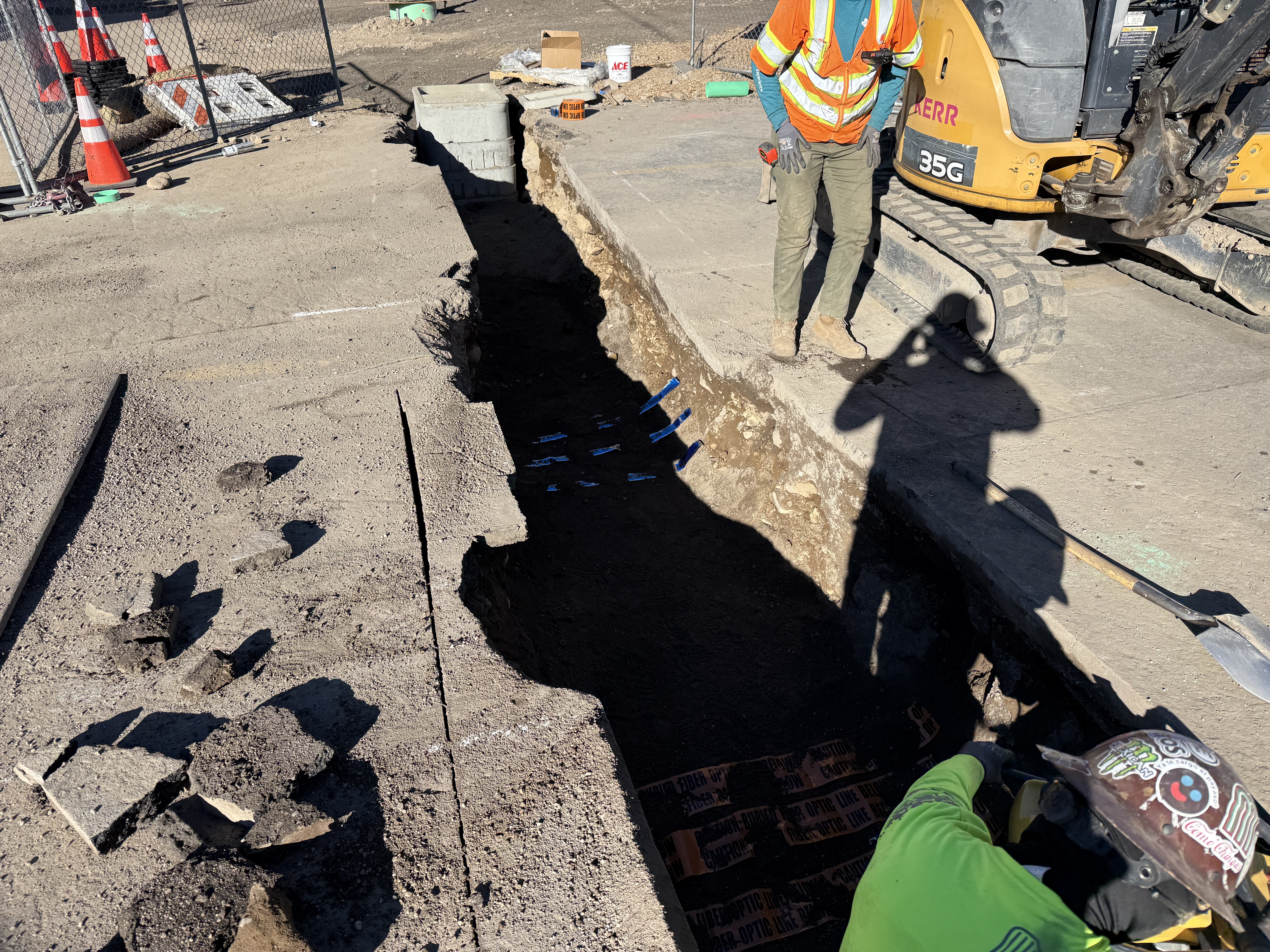 The photo shows a partially excavated trench in an early stage of utility installation, with an individual working at the trench base and a small excavator nearby. Soil is exposed, and there is a visible pipeline wrapped in protective tape. Orange traffic cones and barriers are used to demarcate the construction area.