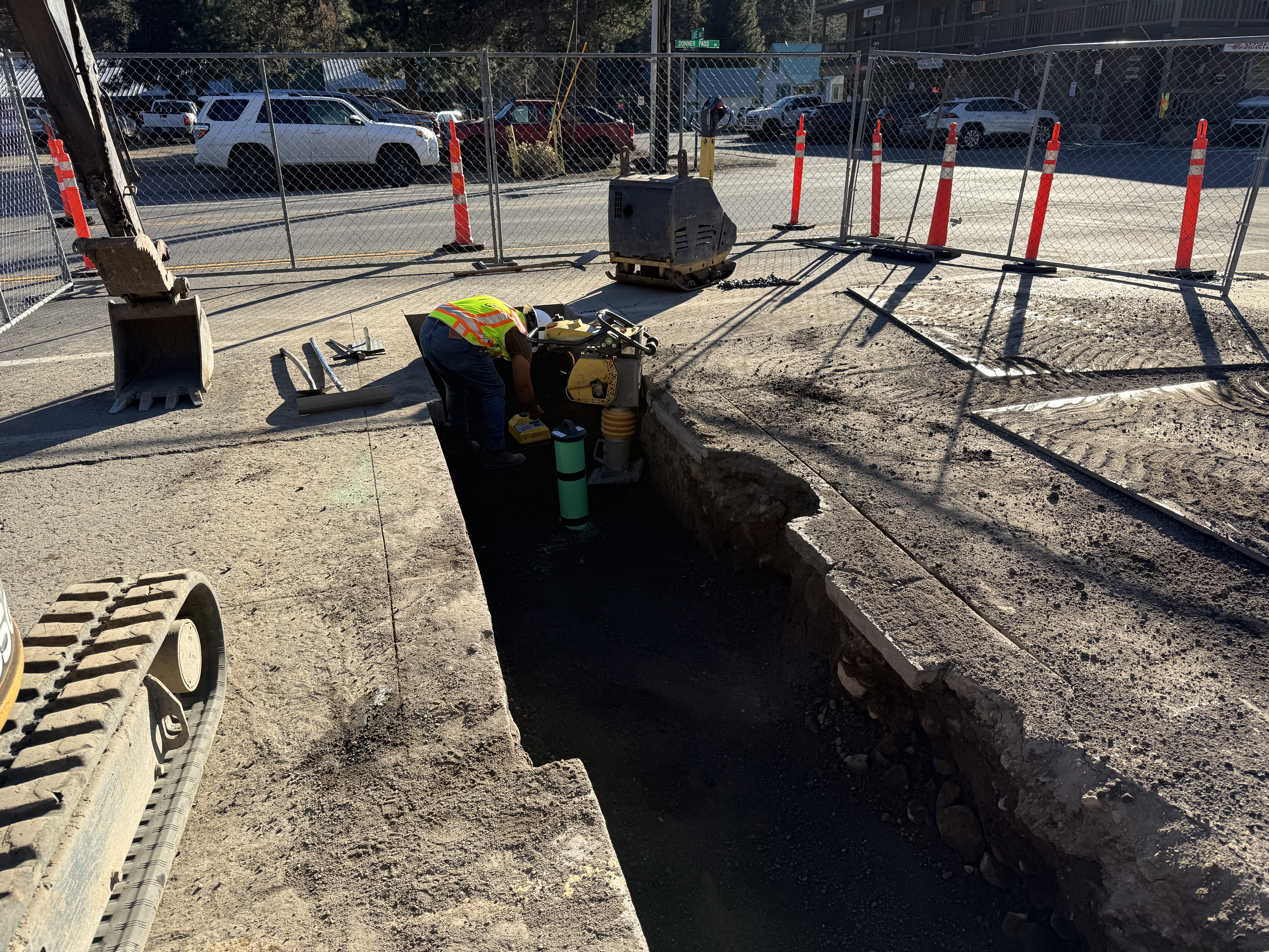 The photo shows an active construction site with a trench being excavated. A worker is seen operating a compactor in the trench, likely compacting backfill material. The site is fenced off with safety barriers and cones. Equipment including an excavator is parked nearby.
