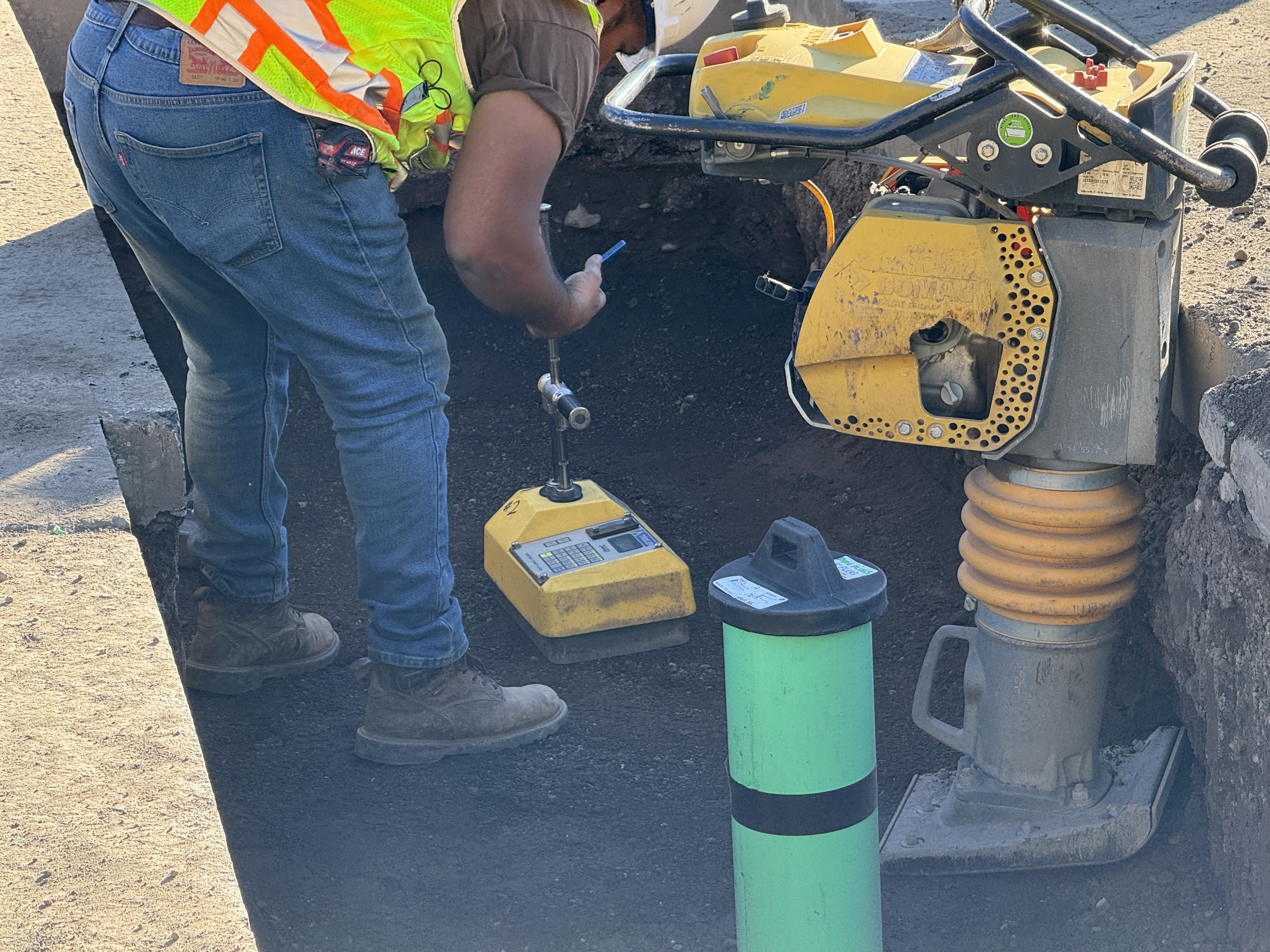 A construction worker is using a nuclear density gauge to test soil compaction at a utility work site. Visible equipment includes a compaction rammer adjacent to the test area, suggesting preparation for backfill operations. The worker is wearing a high-visibility vest, indicating active safety compliance on site. The scene suggests a quality control stage in trench preparation before pipeline installation.