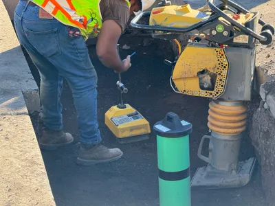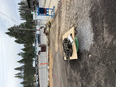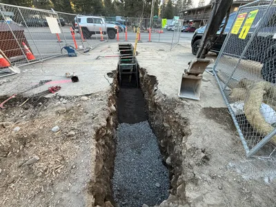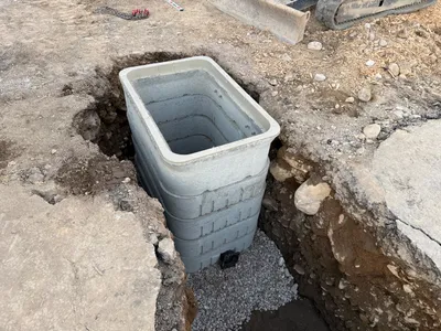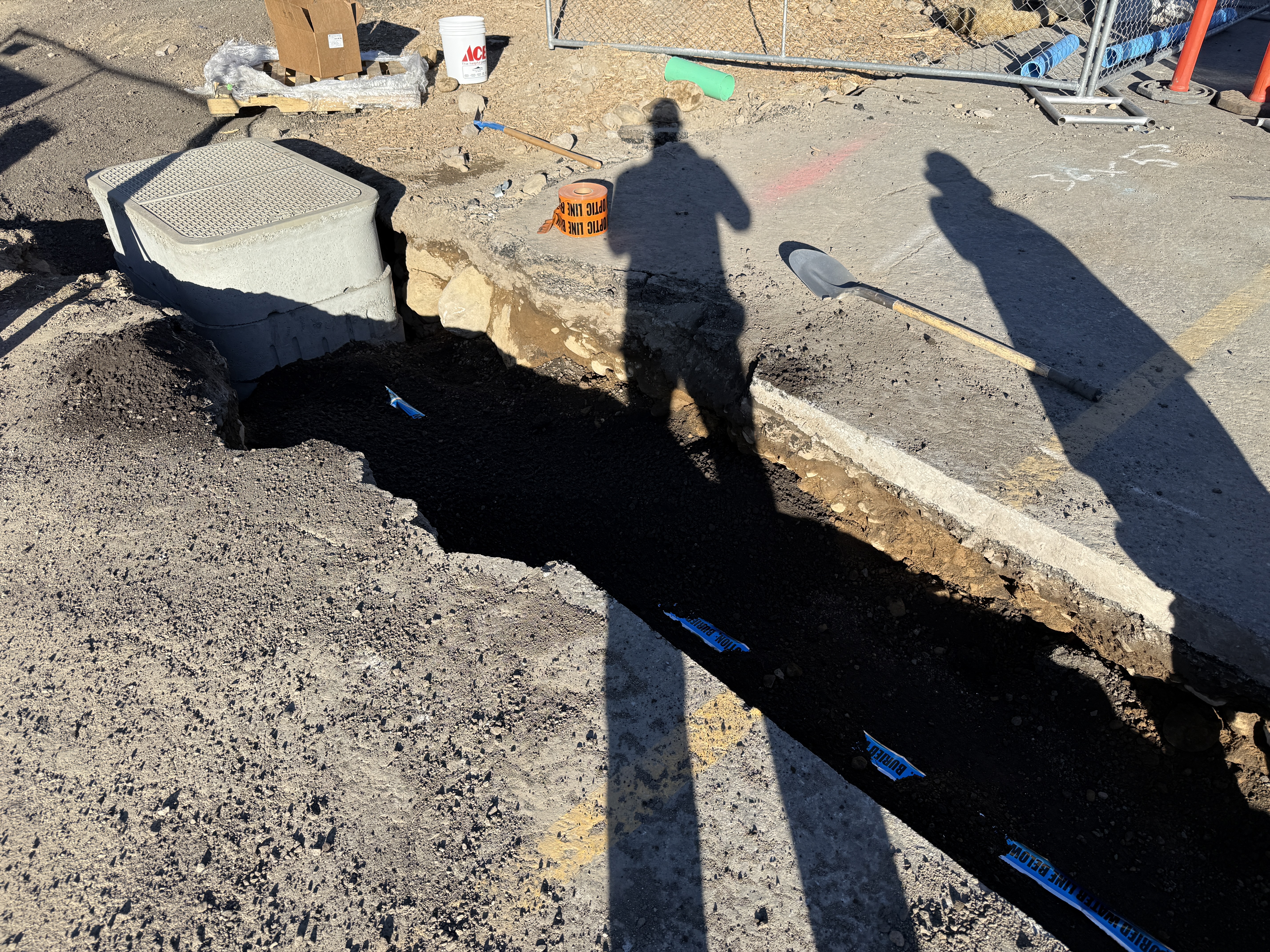 The photo shows a trench excavation adjacent to a concrete surface with a new concrete utility vault installed. Construction is in the trench-excavation phase with loose soil and gravel piles visible. Blue caution tape is laid in the trench, indicating underground utilities. Shadows suggest a sunny day, and there is a shovel resting on the ground, indicating manual labor involvement.
