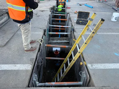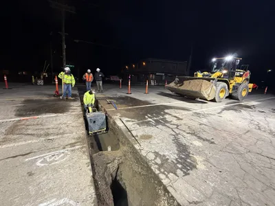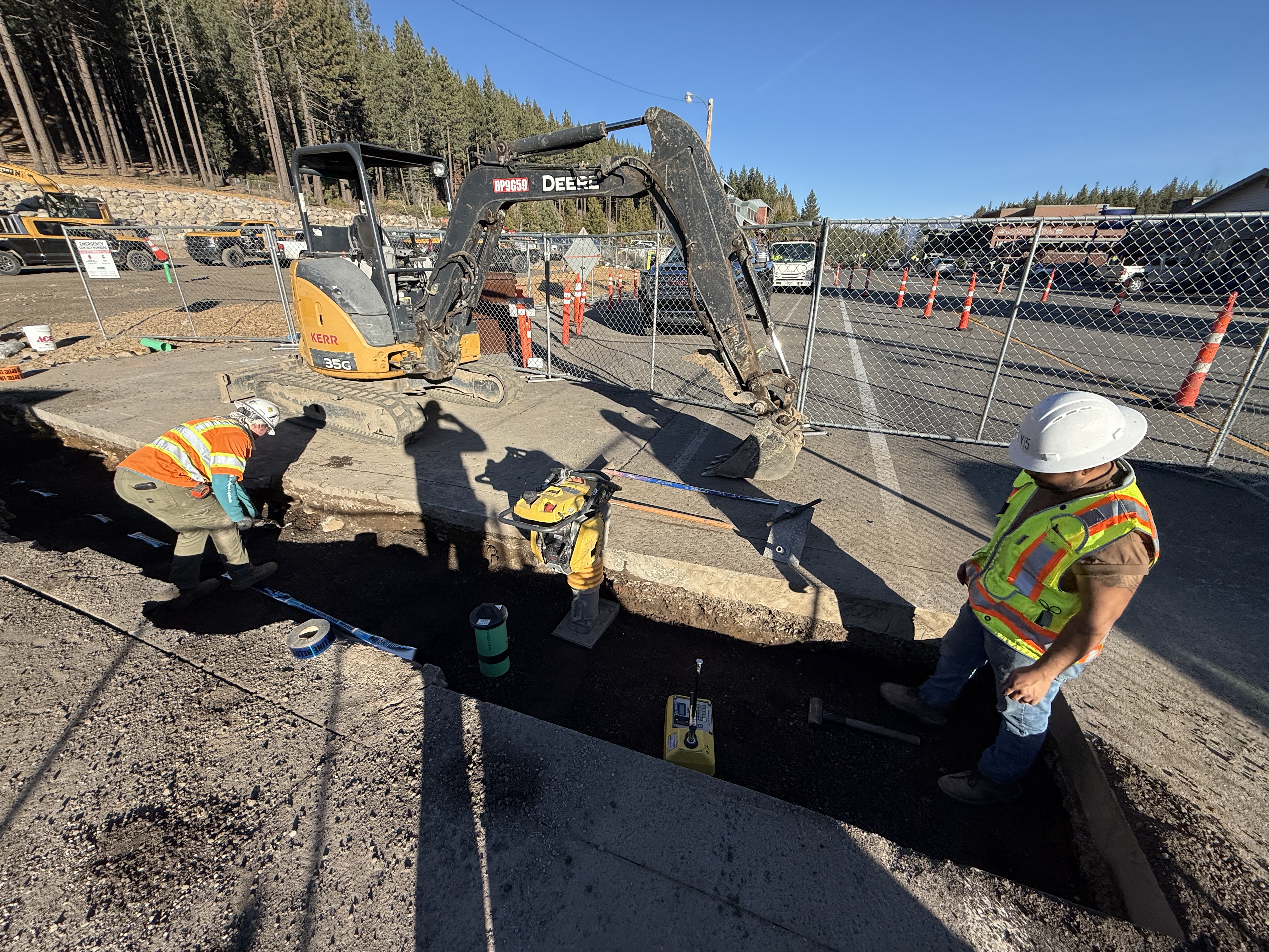 The image shows a construction site where a trench is being prepared as part of underground utility infrastructure installation. A backhoe excavator is positioned near the trench, indicating ongoing or recent excavation work. Workers are present adjusting or laying out materials, possibly preparing for pipeline installation. Traffic cones and a chain-link fence around the perimeter suggest controlled access and safety precautions.