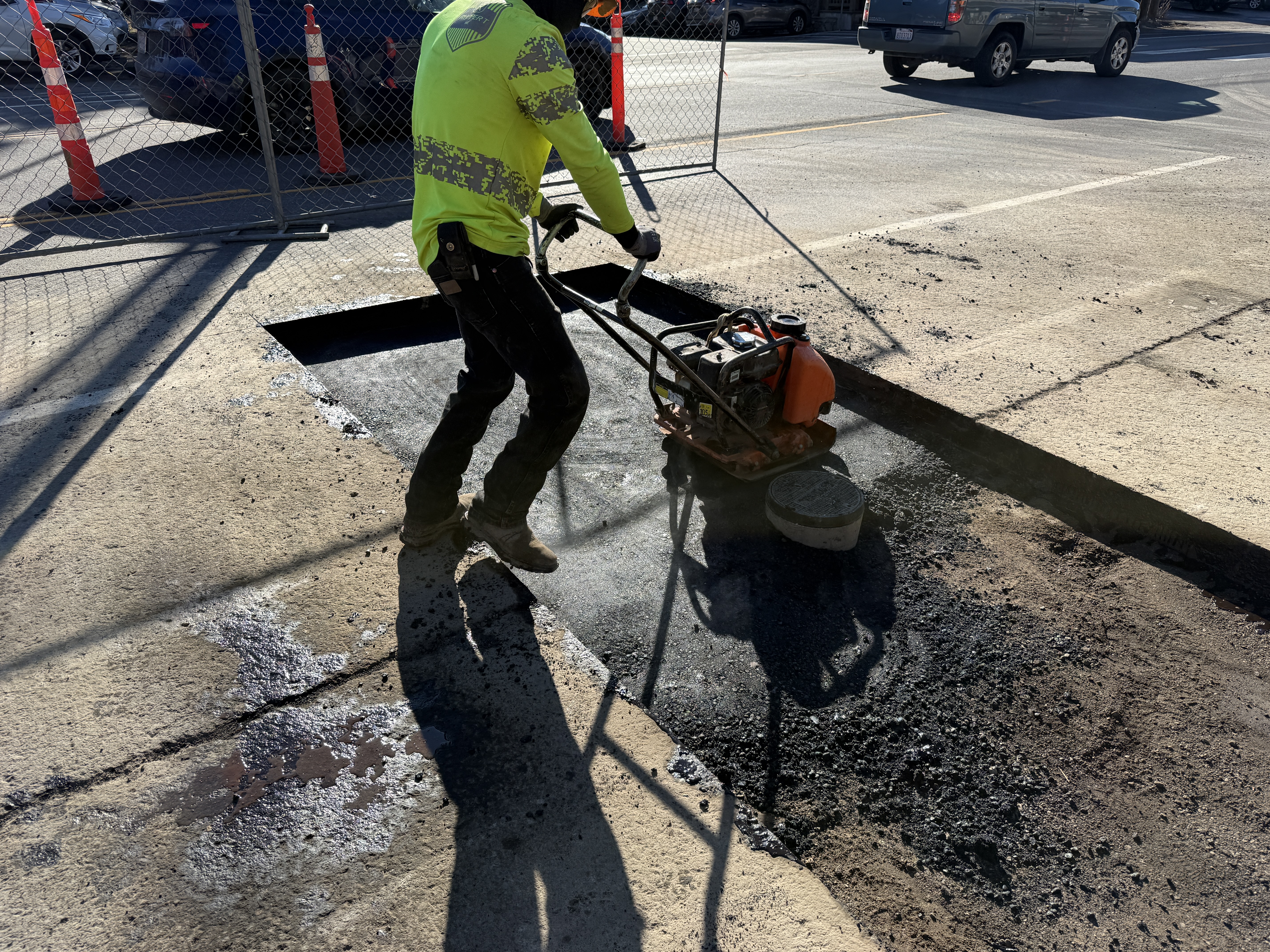 The photo shows an individual operating a vibratory plate compactor to compact asphalt in a patch area on a road surface. The compaction work is part of the surface restoration process following recent underground utility work. Traffic cones and a temporary chain-link fence are in place to delineate the work zone, and vehicles are visible passing nearby.