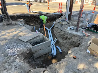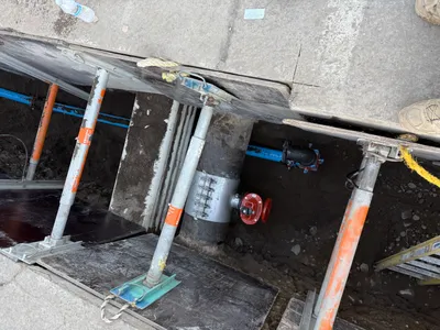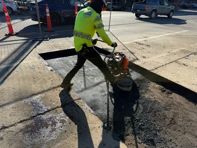 A construction worker is using a mechanical concrete saw to cut through asphalt pavement. The worker is positioned over a trench, indicating that surface restoration is underway. The site is fenced off with traffic cones suggesting an ongoing traffic control setup. The cutting activity is preparing the site for continued underground utility work.